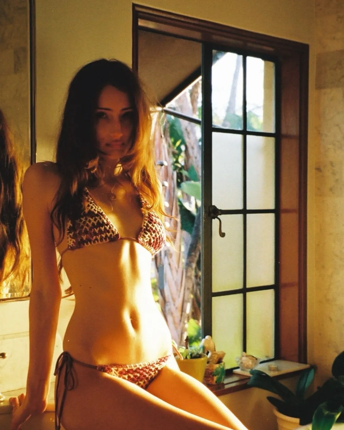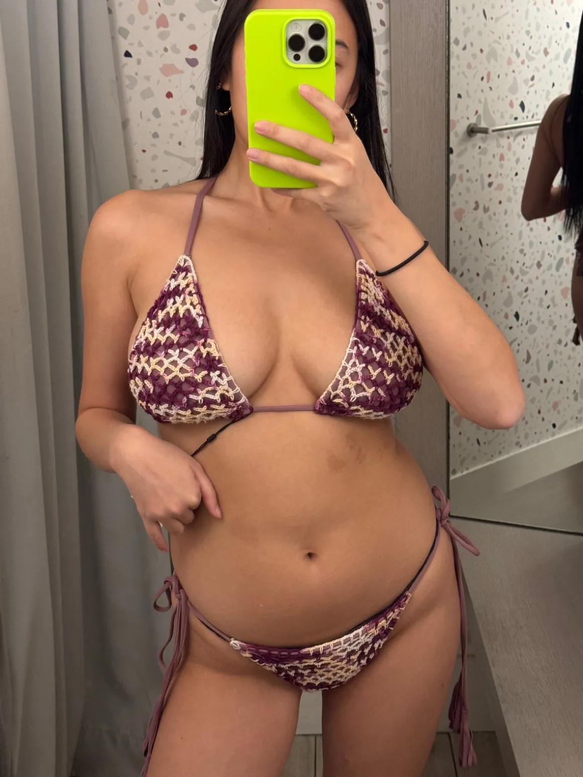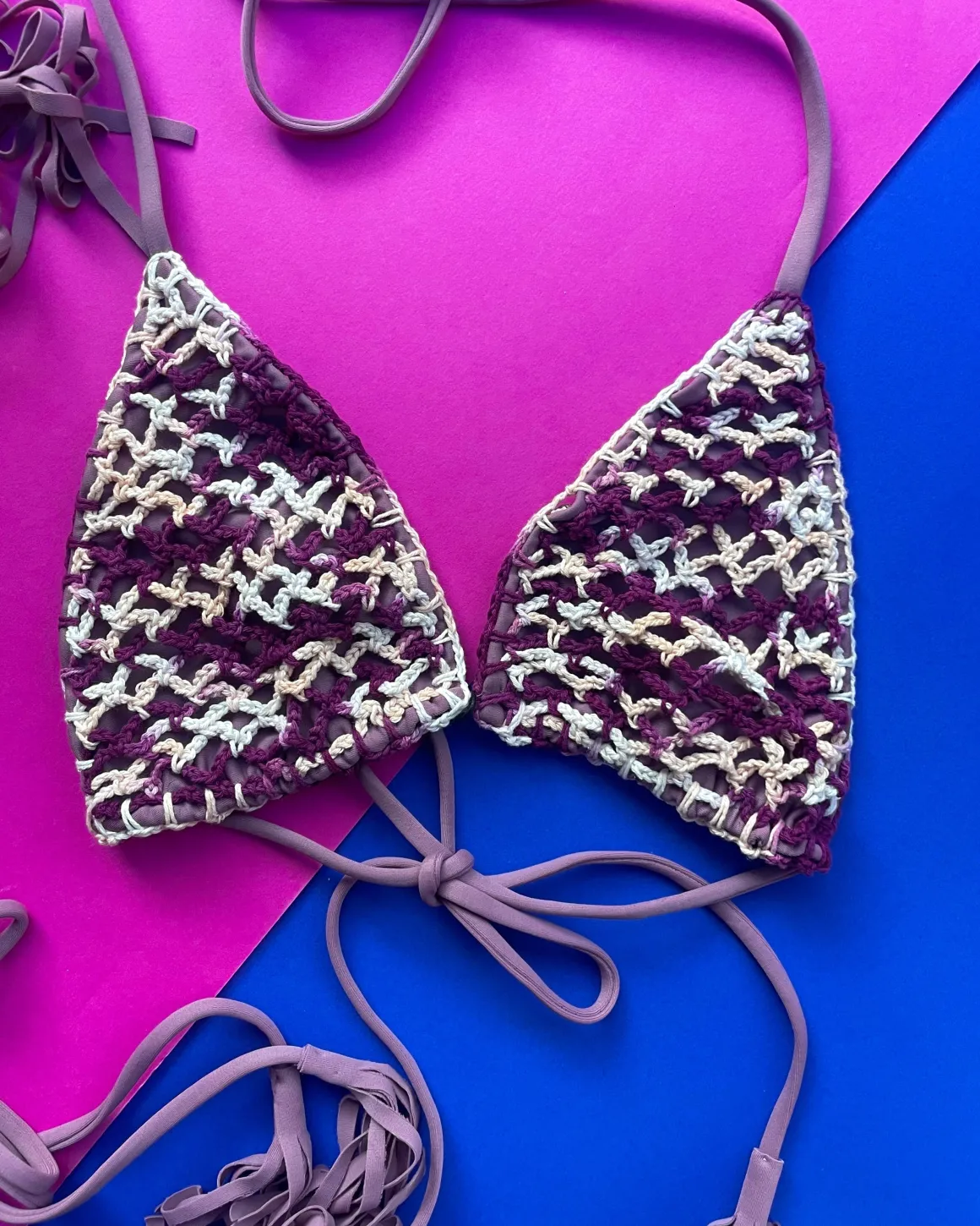 This classic triangle crochet top with adjustable tassel straps gives off sweet 70s chic with a modern flair. Eggplant purple crocheted with cream and subtle orange hues.