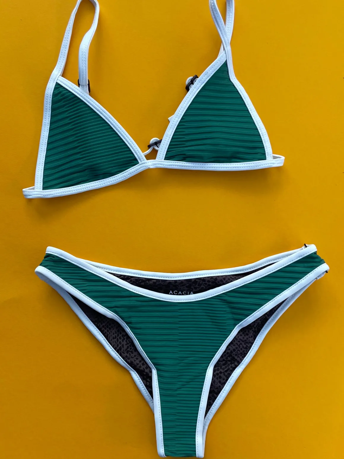 A high cut bottom with moderate to cheeky coverage in a ribbed fabric and contrast cream piping.