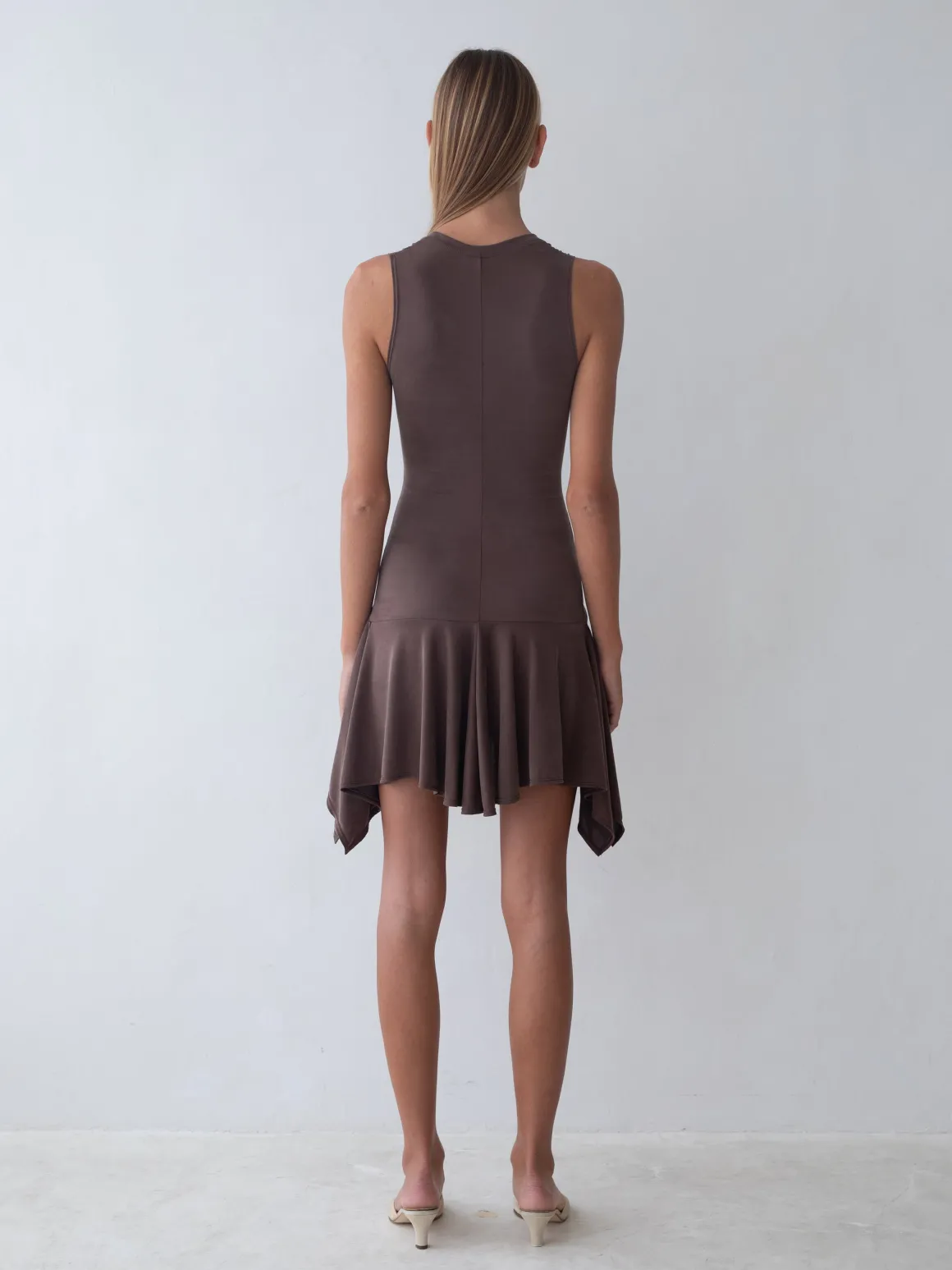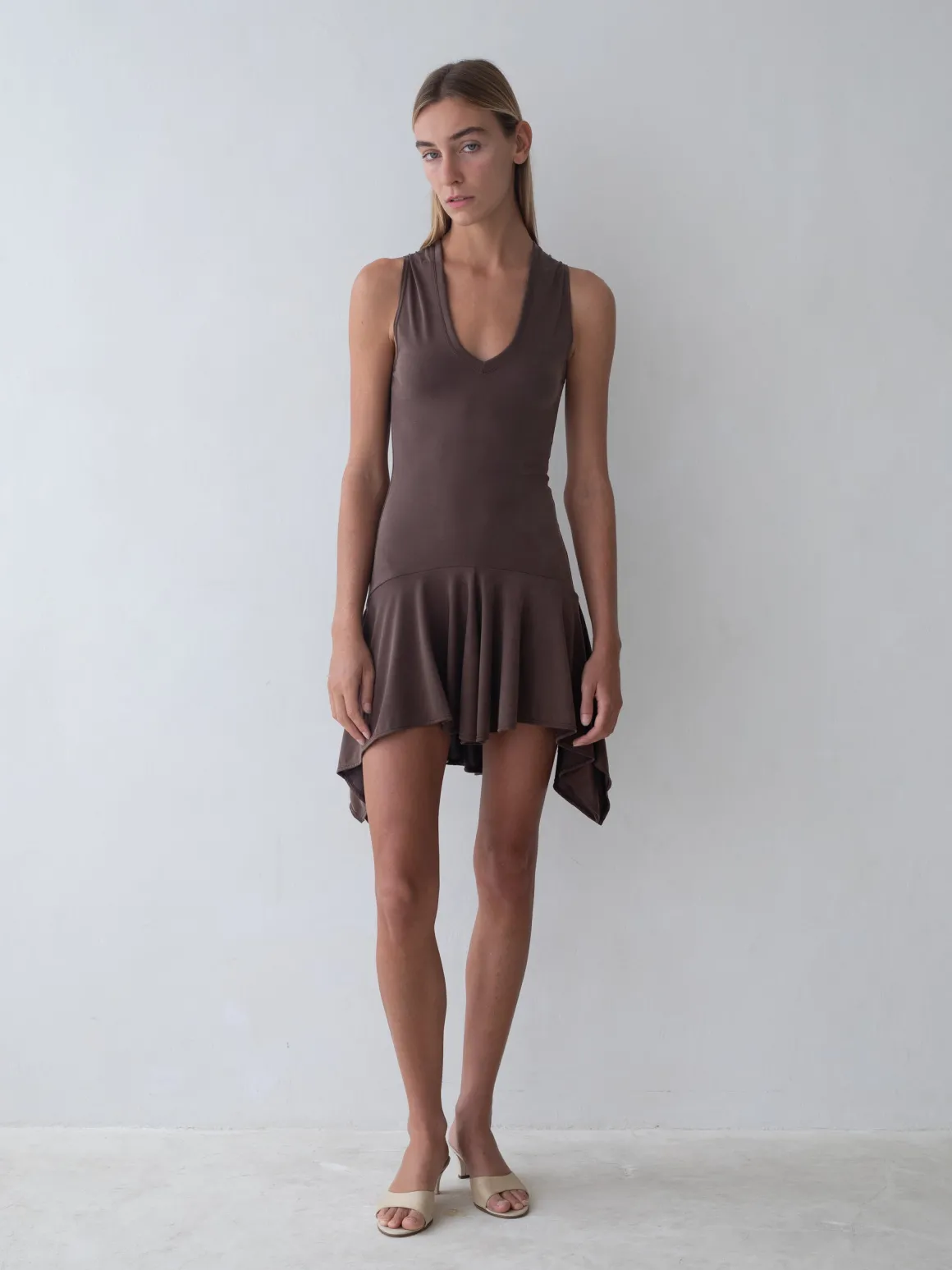 Soft AF sleeveless dress with V-neckline, fitted bodice, drop waist, and flirty handkerchief hem. The modal has a suede-like finish to it.