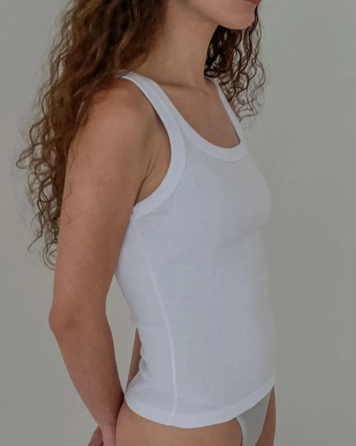 Another white tank to add to your rotation for the warmer months. Heavyweight cotton tank with thick straps and rounded neckline. Central seam at back.