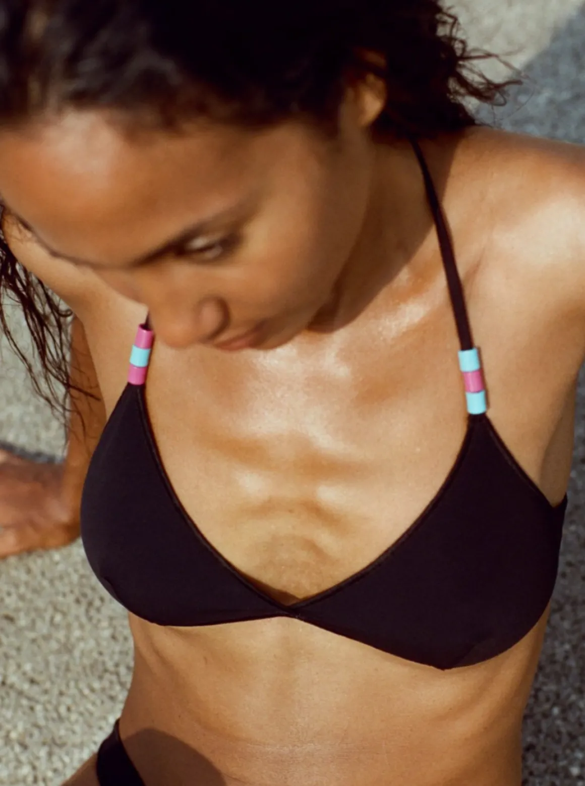 Simple halter triangle bikini top with playful bead details on the neck straps.
