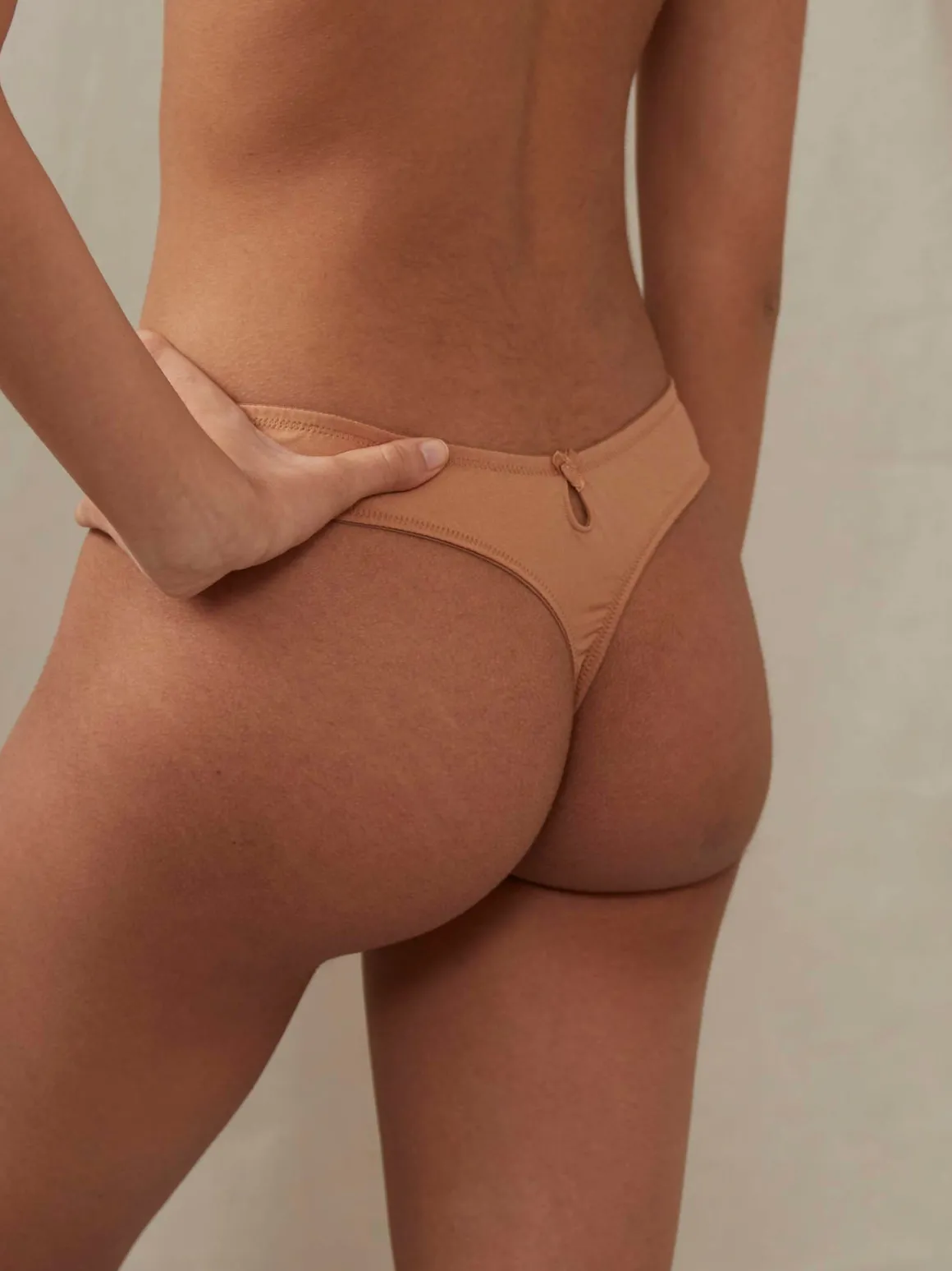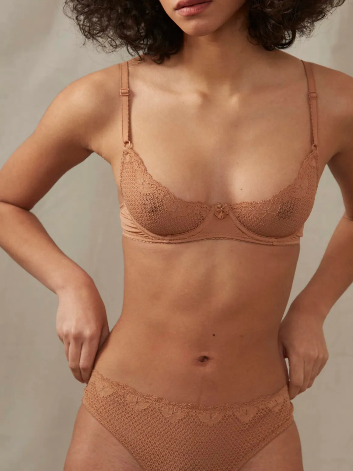 A low-rise thong with lace on the front and the stretch sateen on the back.