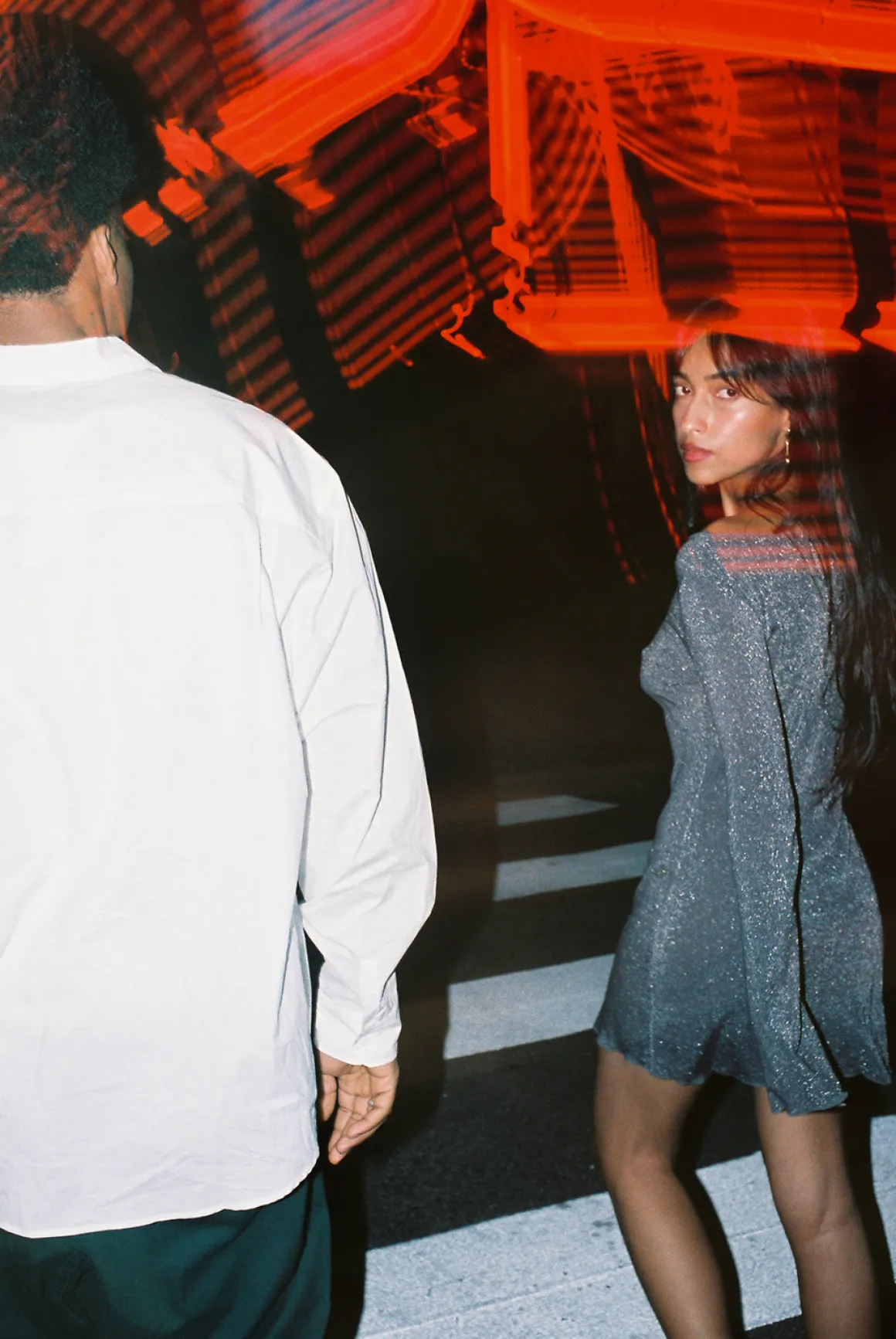 Let’s get this party started right! A boat-neck long sleeve mini dress in a slinky, sparkly, knit fabric.