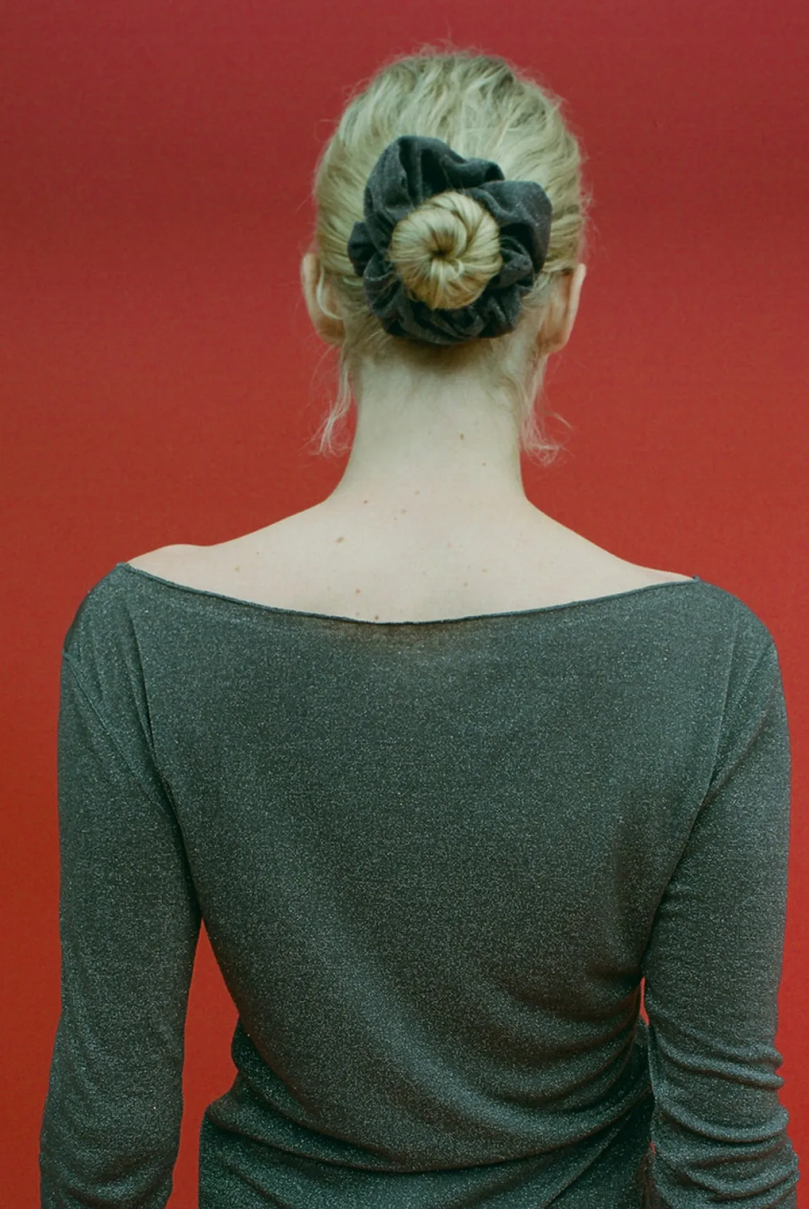 The perfect, classic scrunchie. Made in Los Angeles from a lightweight, shimmery lurex knit, imported from Japan.