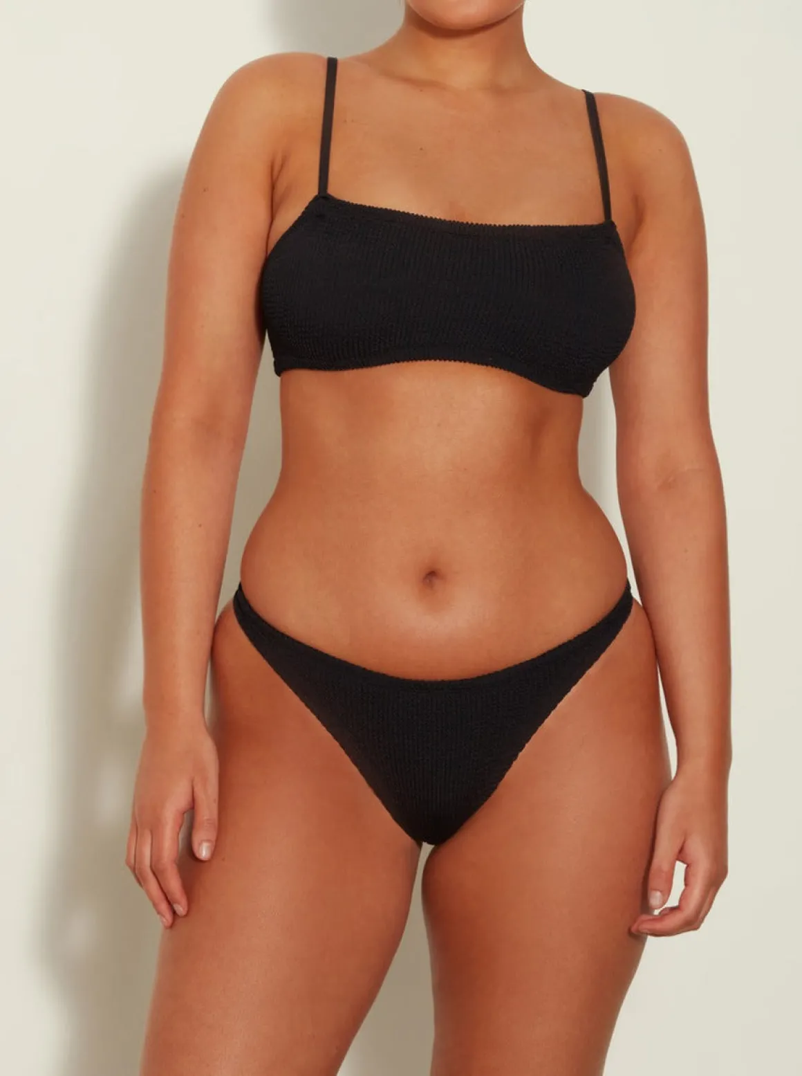 Pullover bikini top with skinny straps and straight across top. Comes with matching high-leg bikini bottoms.