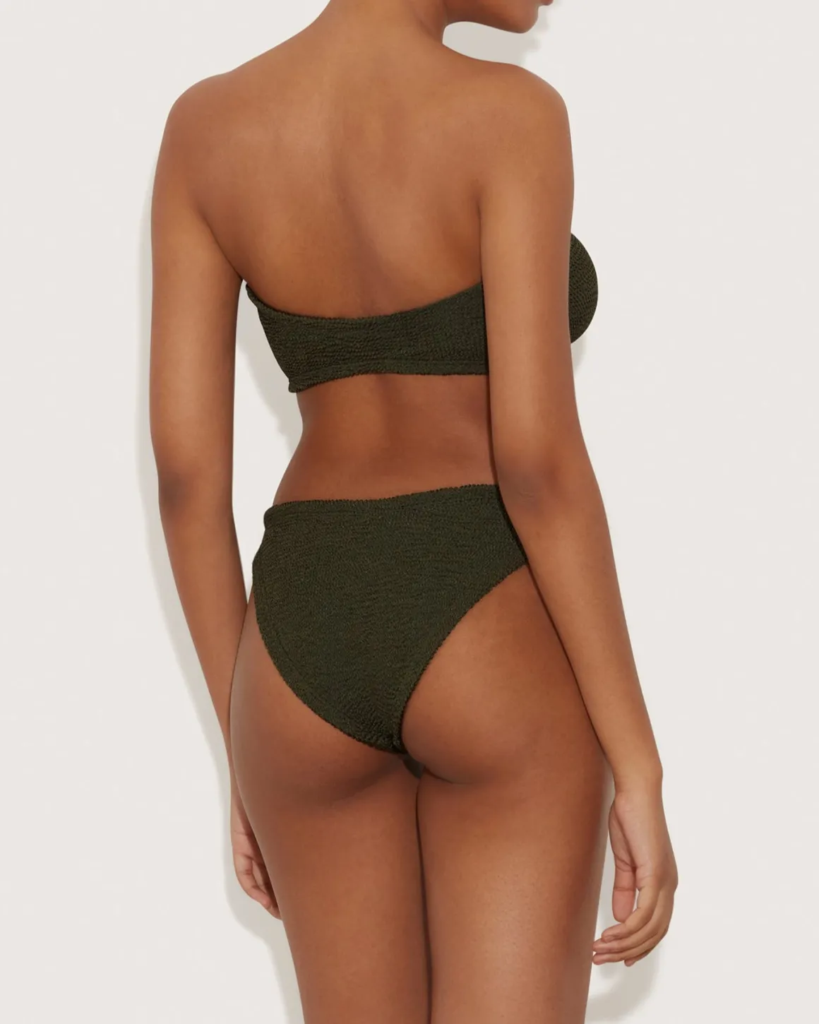 Strapless, perfect for tanning. Fabric covered rings on front gore, and hip sides.