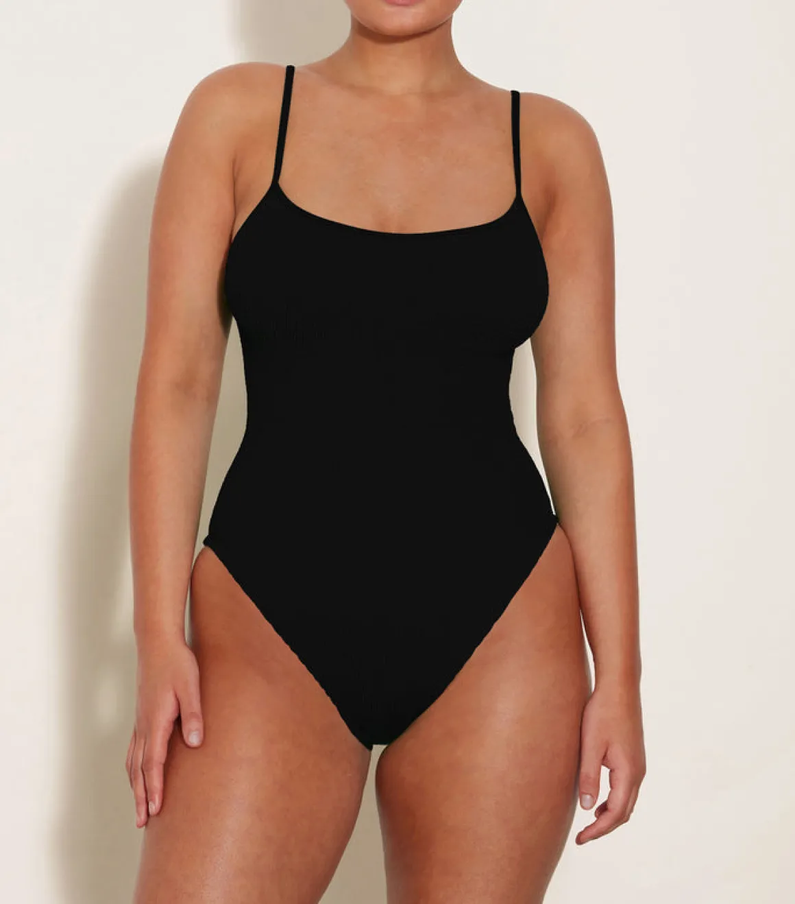 Crinkle one piece with matching lycra straps. Scoop neckline and square back. With medium back coverage.