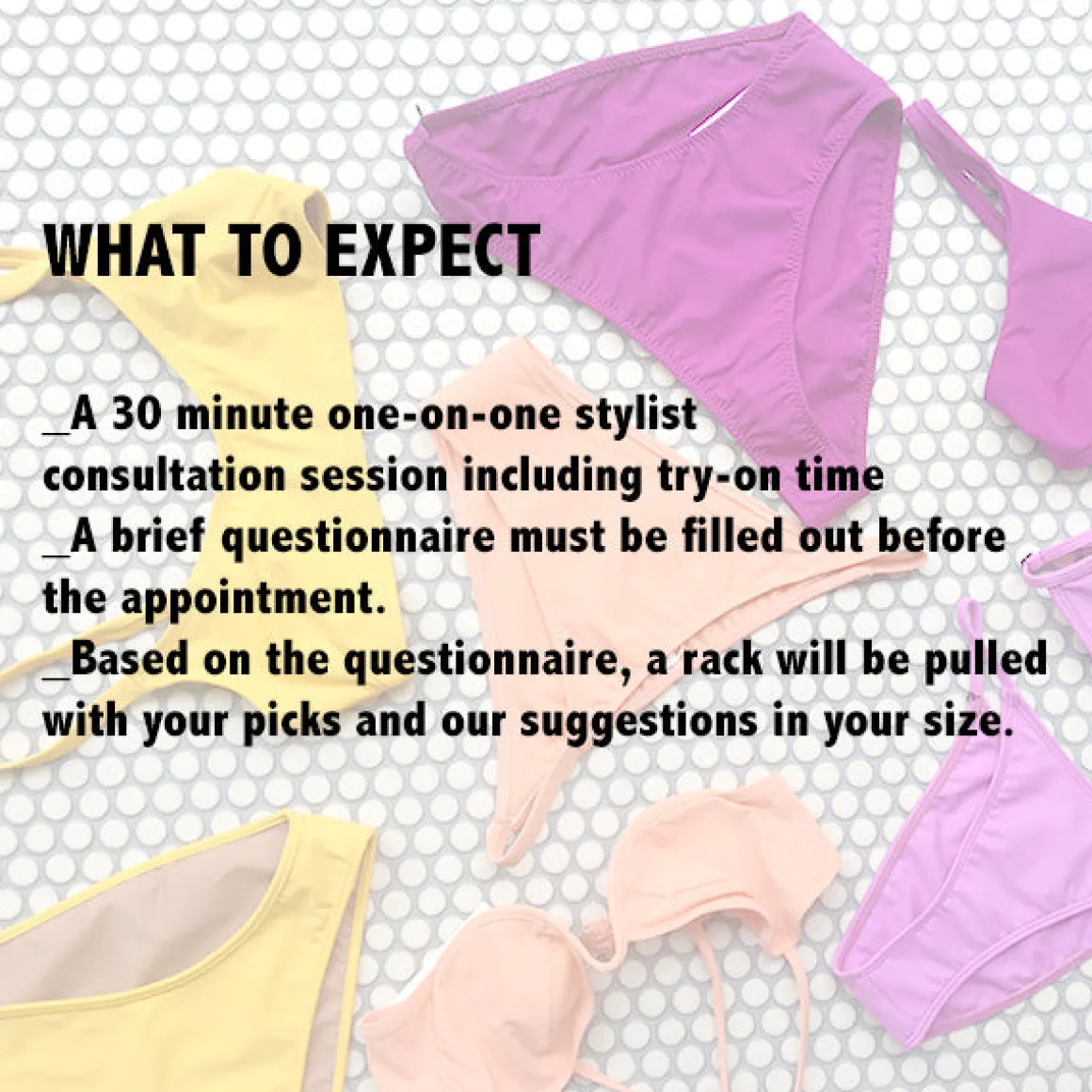 - A 30 minute one-on-one stylist consultation including try-on time.
