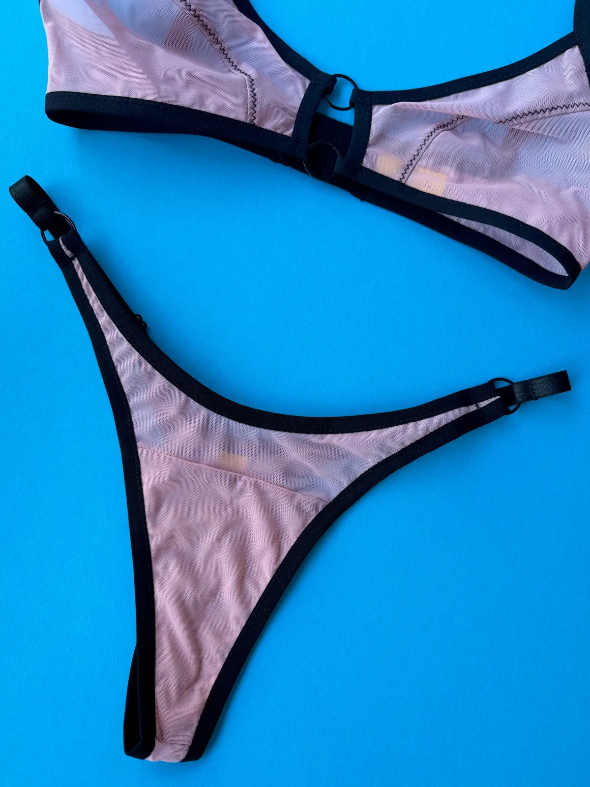 High cut mesh thong in dusty rose with black piping, to match back to the Evan bra.