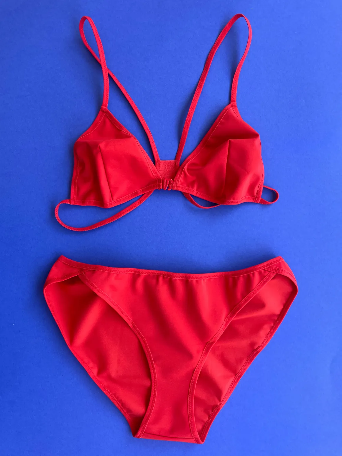 The thrill of tiny triangle cups held together by delicate shoulder straps. A striking back design that balances theentire piece. This piece can be worn as a bikini top but also doubles as a simple bra.