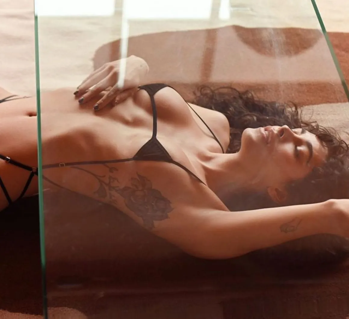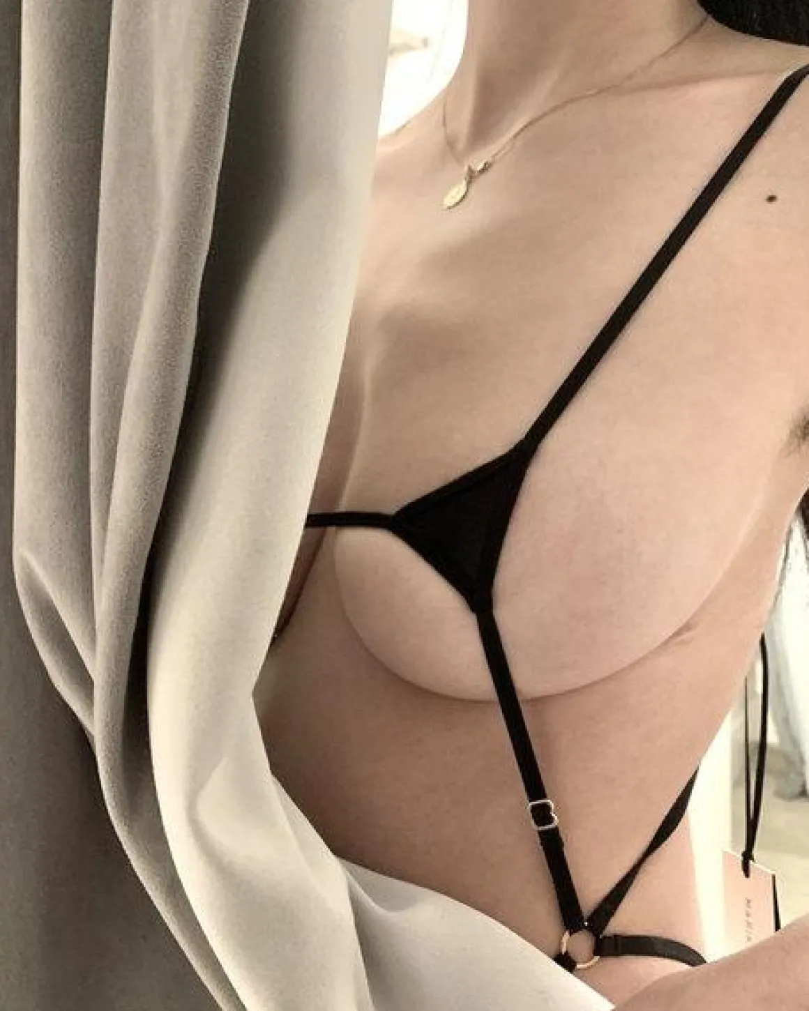 Thin body cage harness that has tiny triangle bra cupsand an ouvert bottom.
