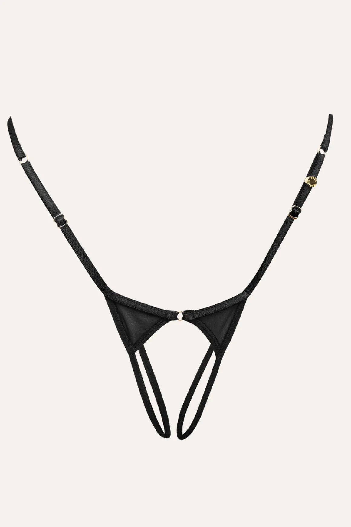 Revealing ouvert thong with delicate straps and flirty front bow and o-ring detail.