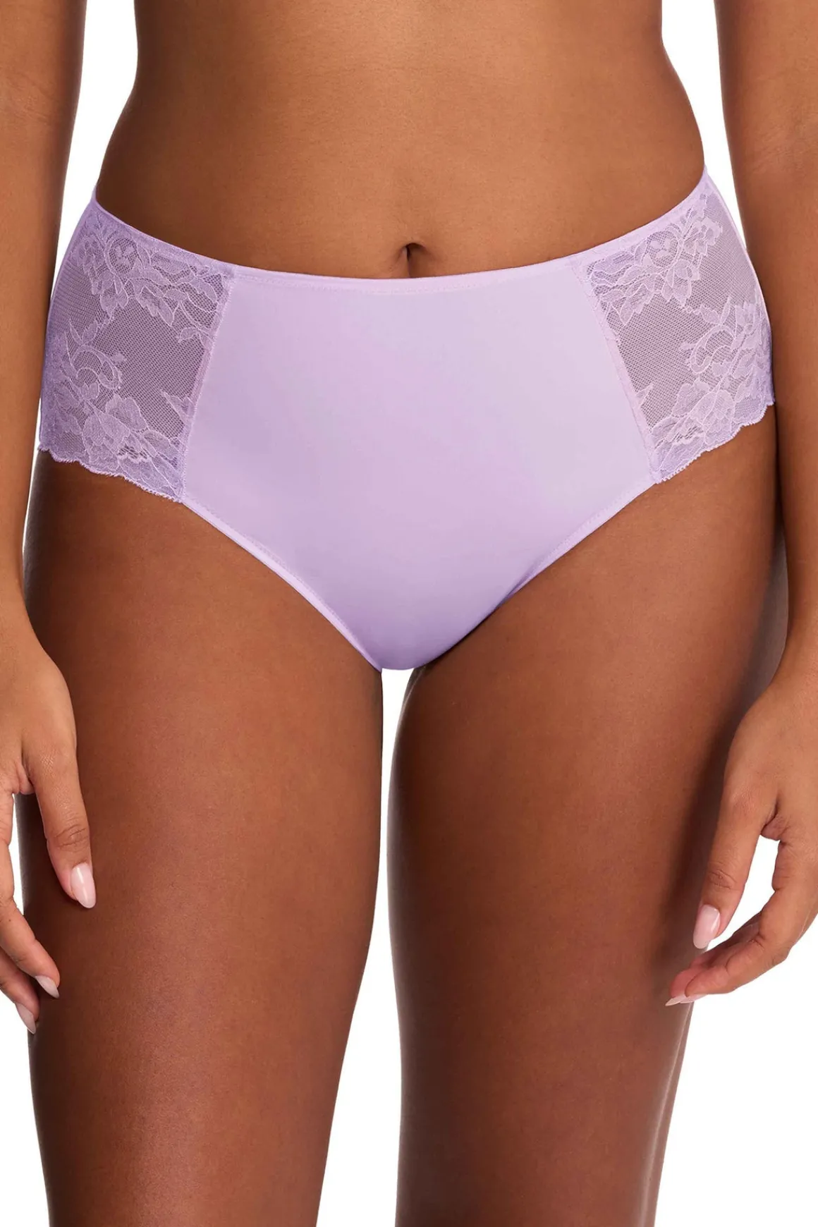 A medium rise fuller brief from Natori to match back to the Statement bra. Lilac lace side panels mixed with soft, stretchy microfiber.