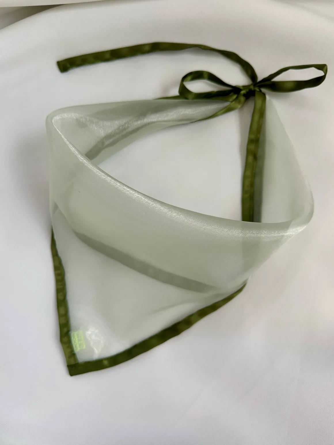 Dreamy sheer organza framed with silky satin ribbon in an easy tie back headscarf, also extremely cute as a neck scarf.