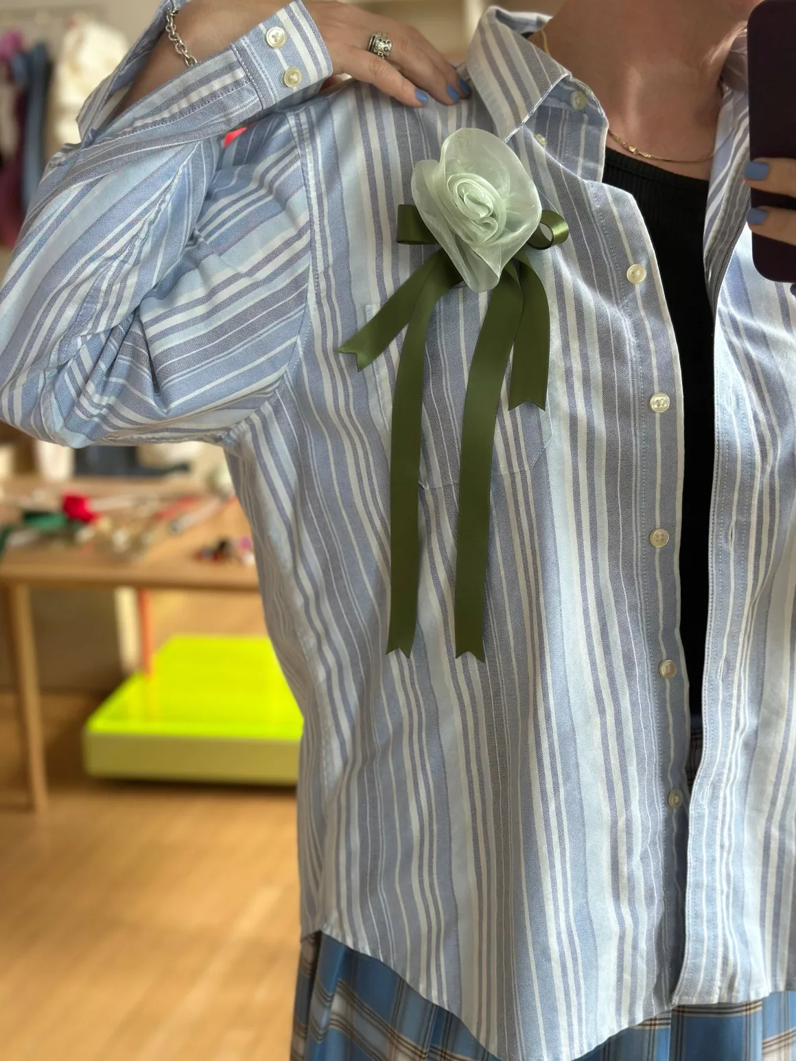 n organza rose, satin bow pin that you can place on your jacket, bag, or anywhere you’d like.