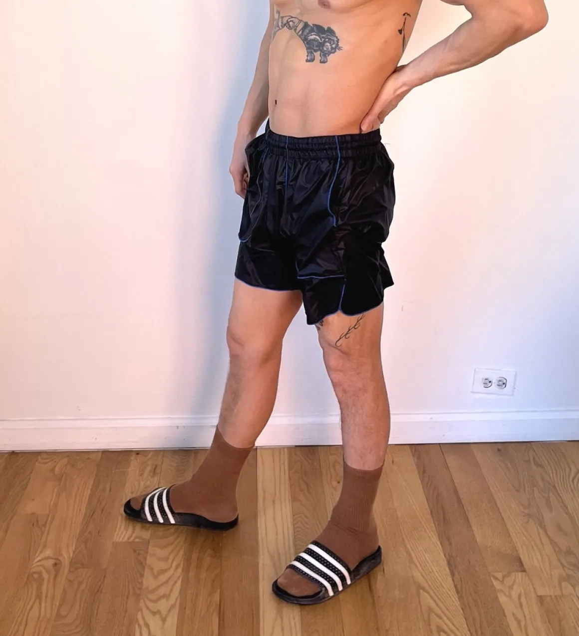 Men’s swim trunks with exposed pockets. Thin, embroidered stitching on hem and pocket hem with two eyelets on each pocket to drain water. Inner mesh underwear insert and an adjustable drawstring.