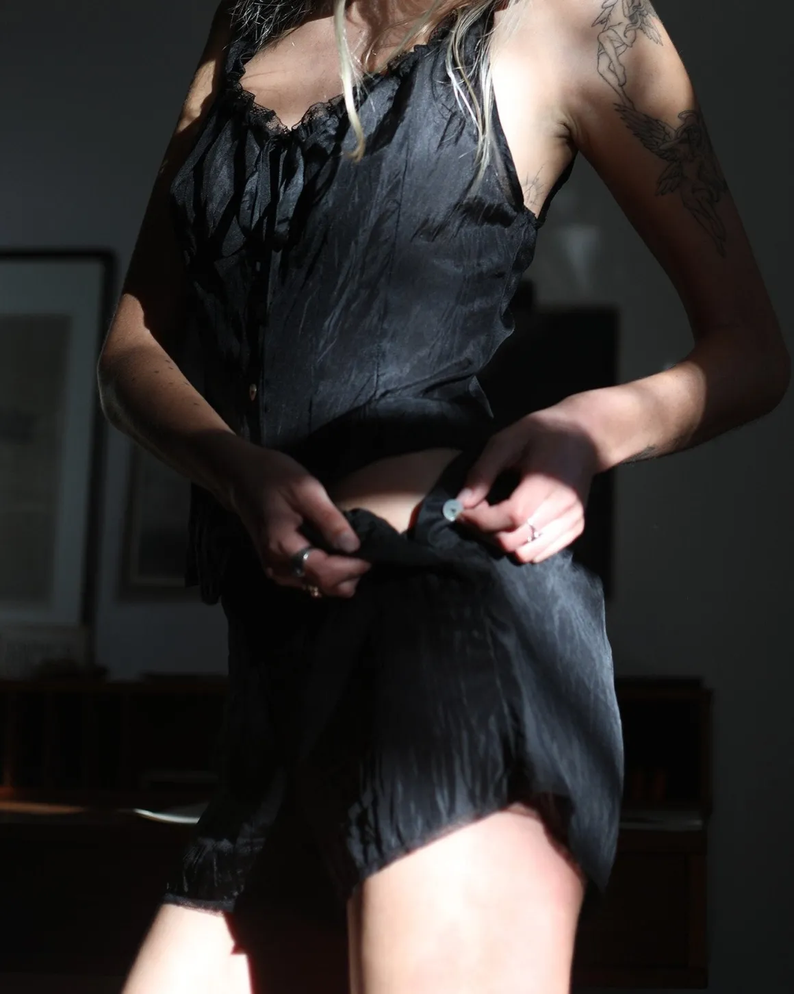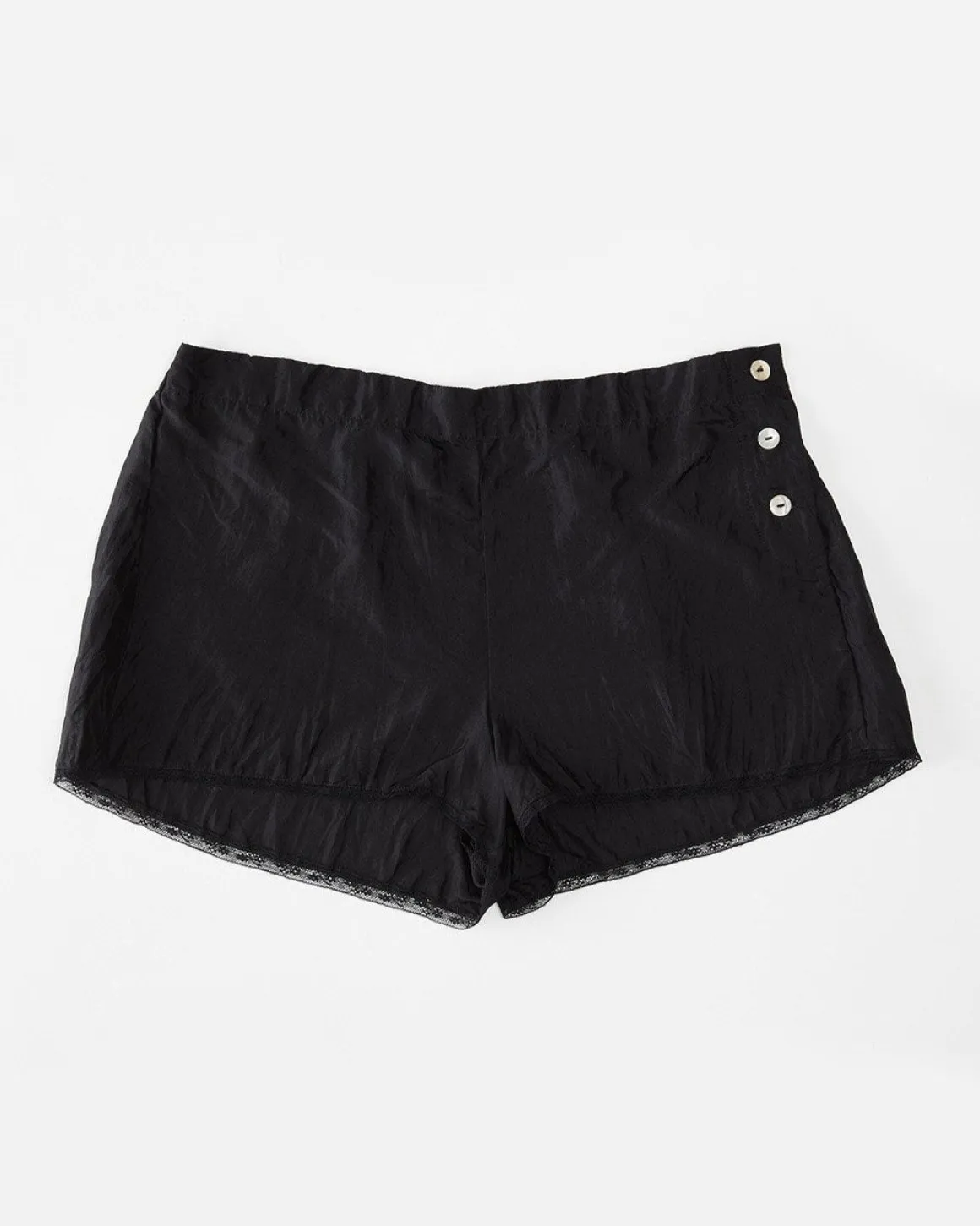 Made from lightweight silk habotai, semi-sheer black tap shorts come with elastic back for comfort and side buttons for a tailored look. Lace trim along the legs matches back to either top.