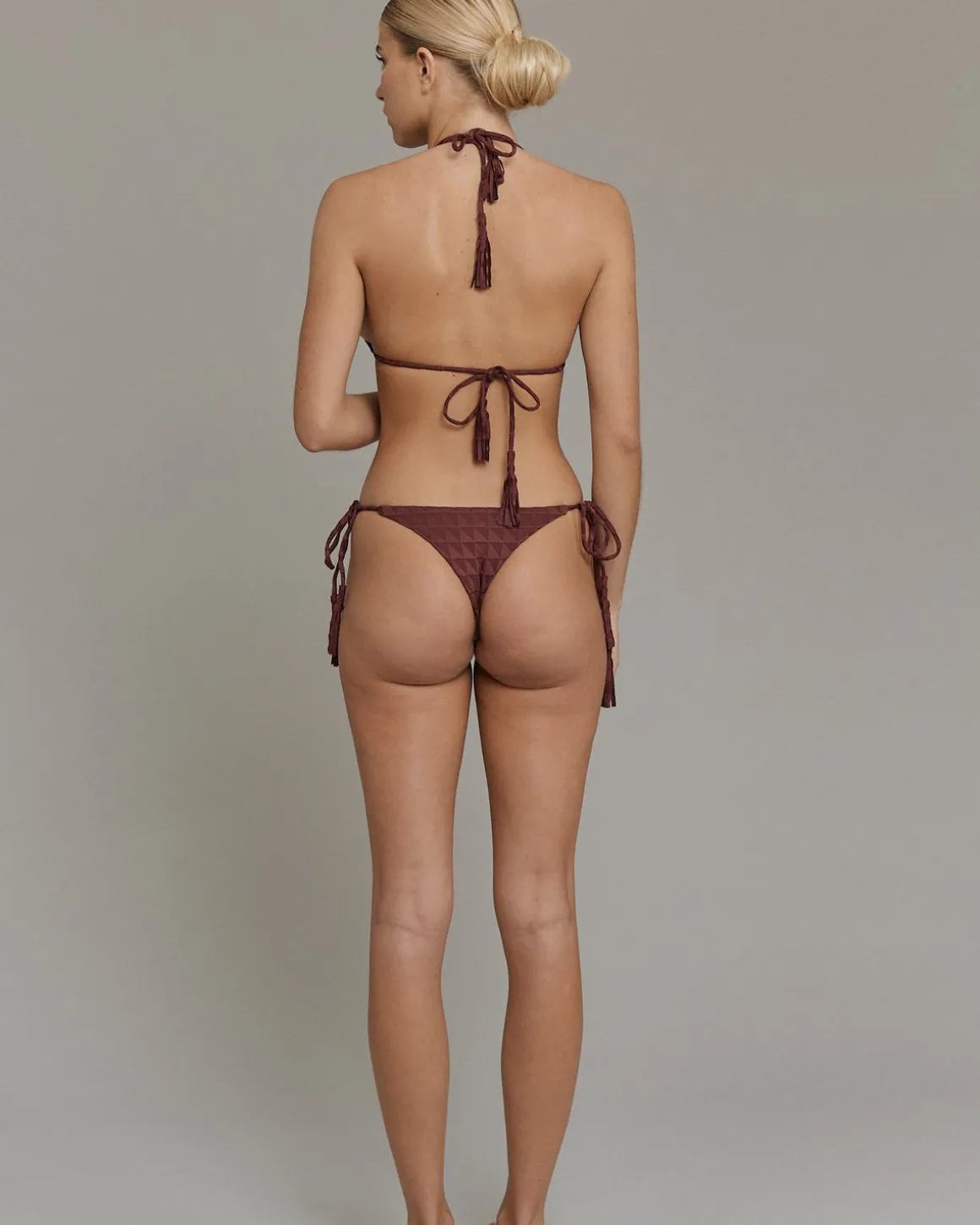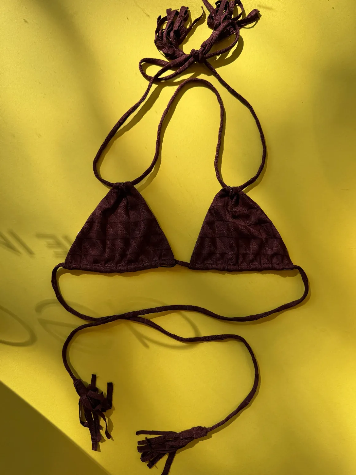 Always a best-seller, due to its minimal coverage and surprise support. Signature tassels finish the straps that go around the neck and around the back. Textured triangle print.