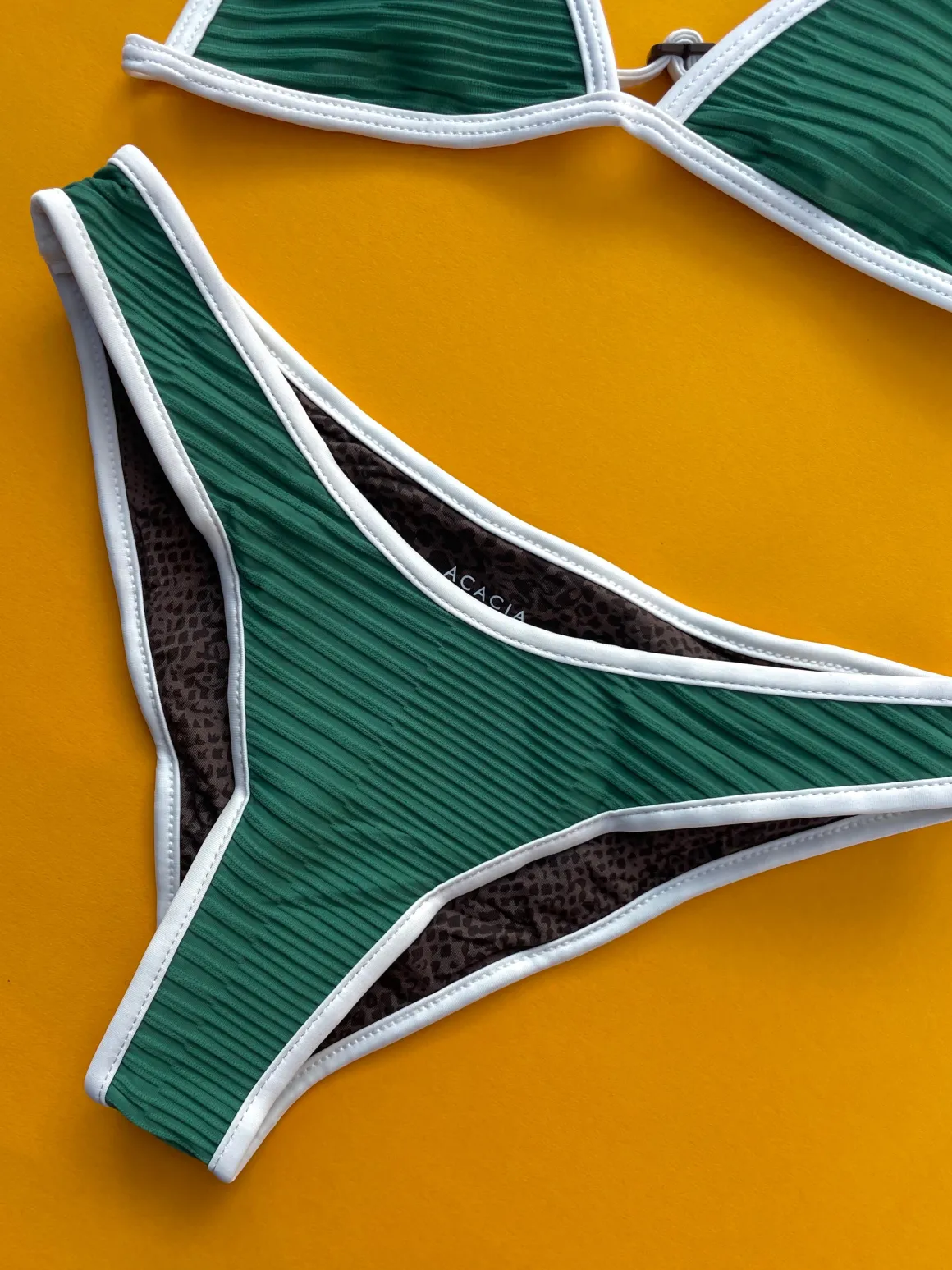 A high cut bottom with moderate to cheeky coverage in a ribbed fabric and contrast cream piping.