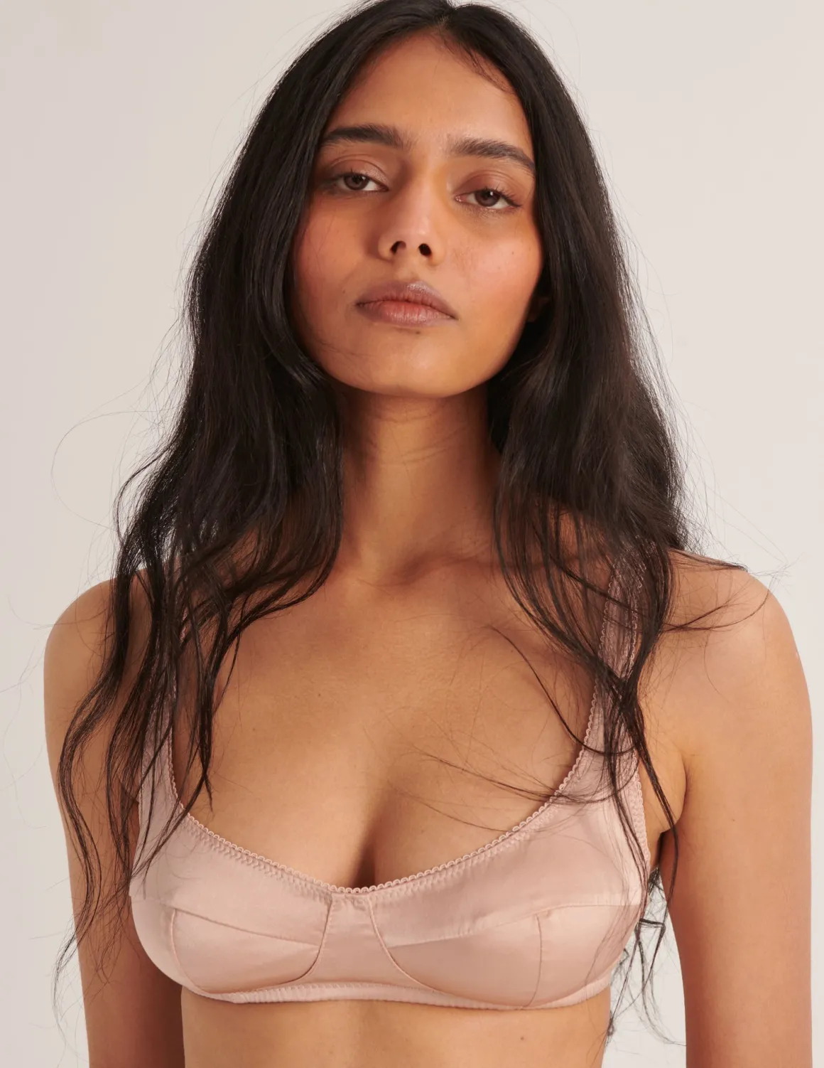 An organic re-imagination of the bestselling Gita bra – now in a wireless, softer support. Same balconette silhouette fabricated in shiny luxurious silk charmeuse. The gentle shaping and natural lift make this ideal for the Summer heat.