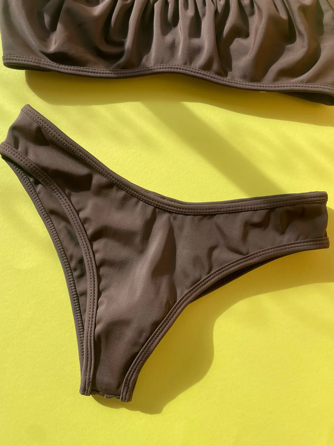 We’re swooning over this adorable, feminine halter bikini set in rich carob brown. The bottom features a slight dip in the front and back.
