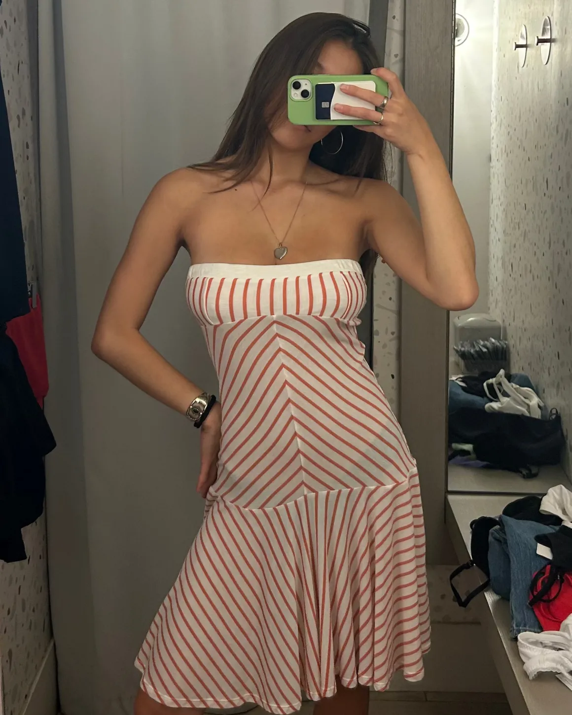 The Claro dress is a flouncy strapless number that’ll put a little spring in your step. Comes in a super soft tencel, flattering striped pattern, and flirty hem. Thick, flat elastic band keeps the dress from falling. Slightly sheer bodice makes this perfect for a day at the beach, while the cups are double lined for ease of mind.