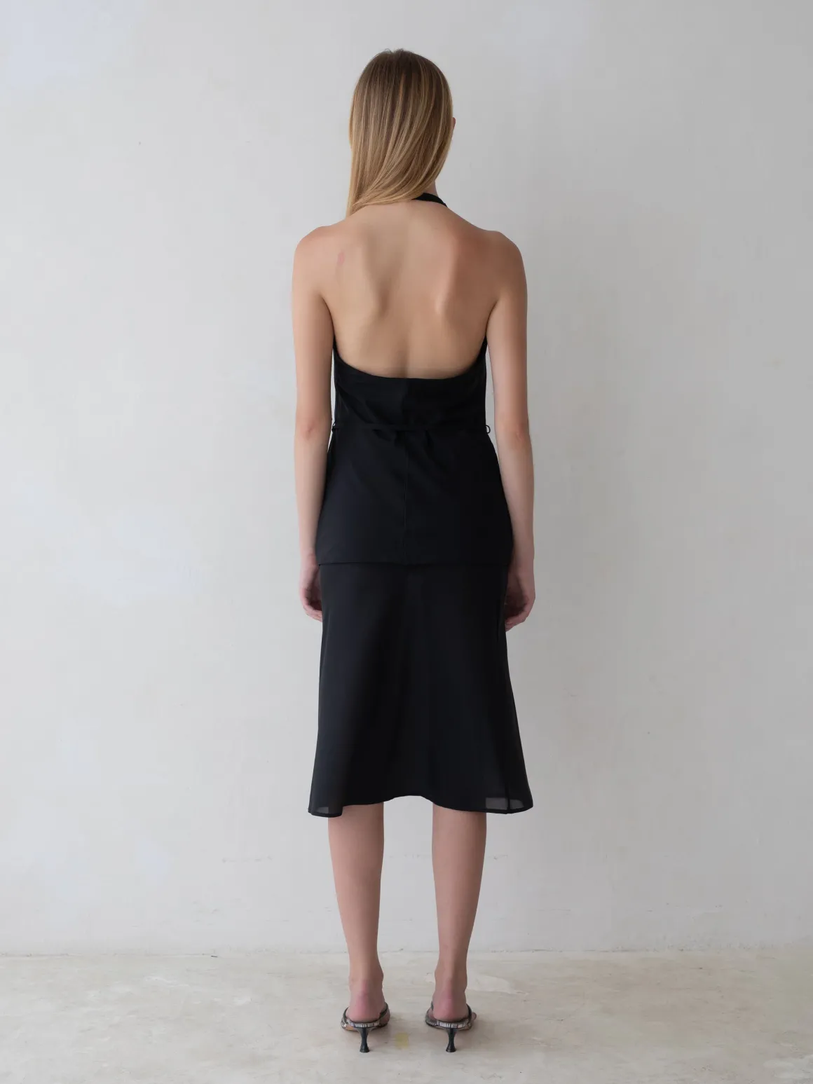 Bias-cut midi skirt with a subtle flared hem and invisible side zip with hook and eye closure.