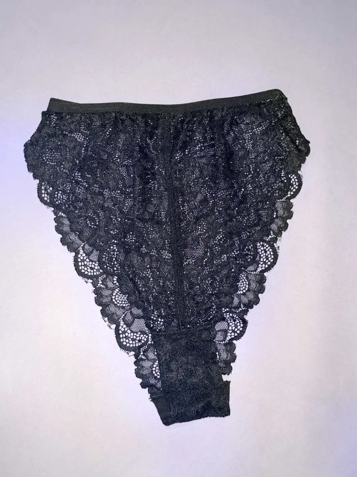 Retro style high-waisted French cut pantymade of high quality black stretch lace. Cheeky, flattering, sophisticated.