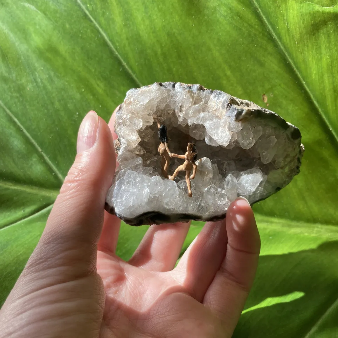 Each miniature body is patiently and lovingly crafted by hand in the Chaparral studio in Los Angeles, Ca. They are 100% one of a kind pieces. The position of the lovers you will receive in the mail will be unique. This means that the color of their skin & hair, shape of bodies and the size and shape of the geode cave will be a total surprise. An original.