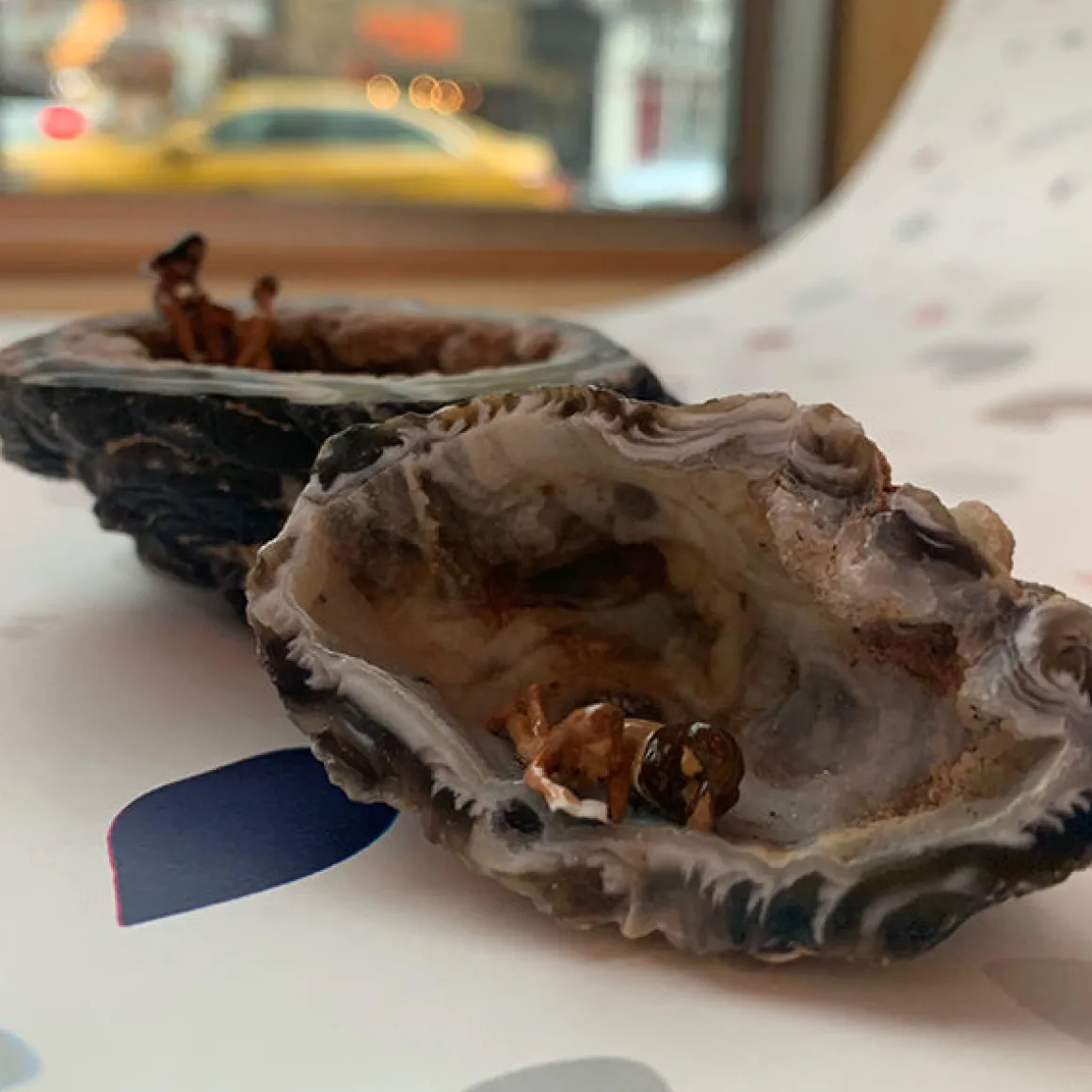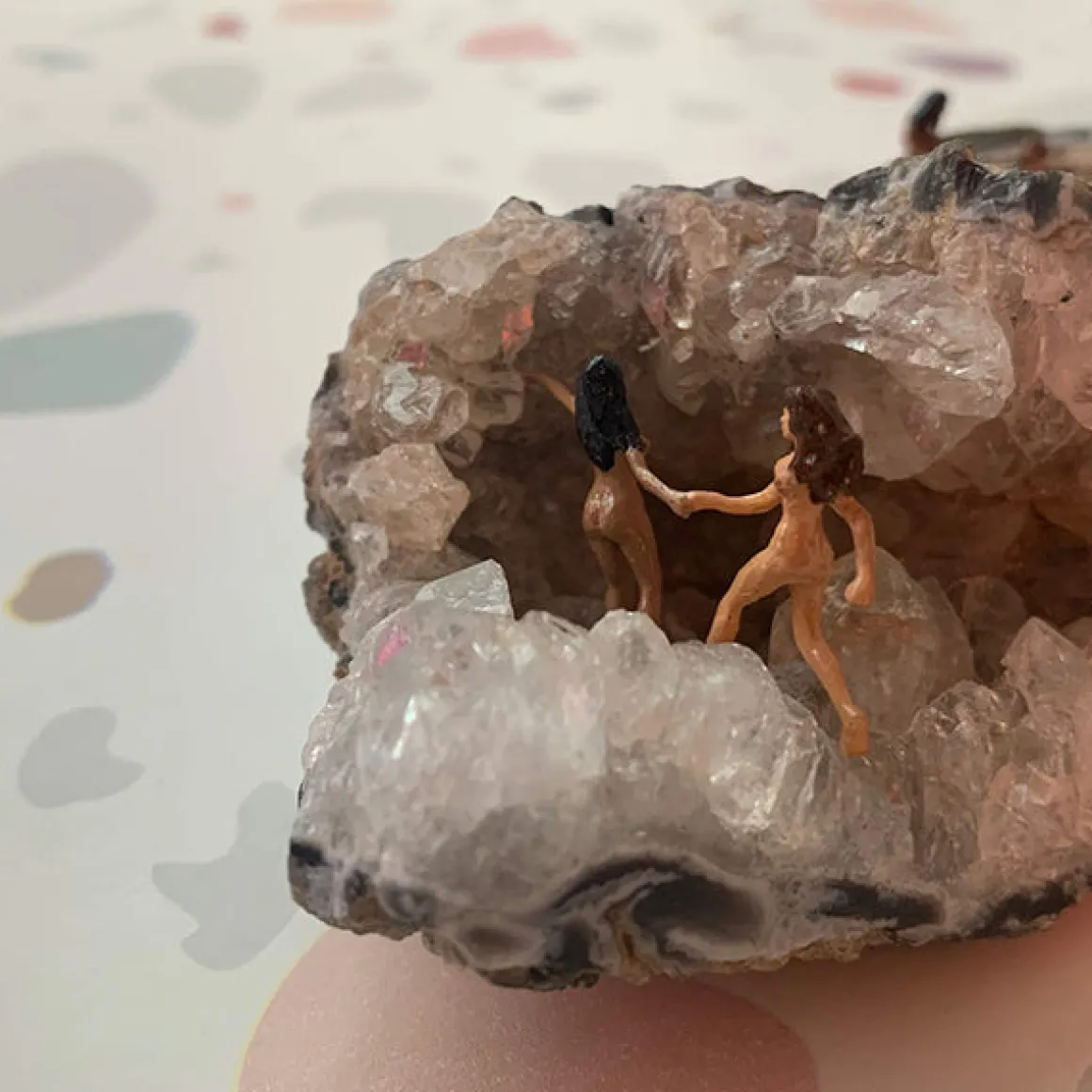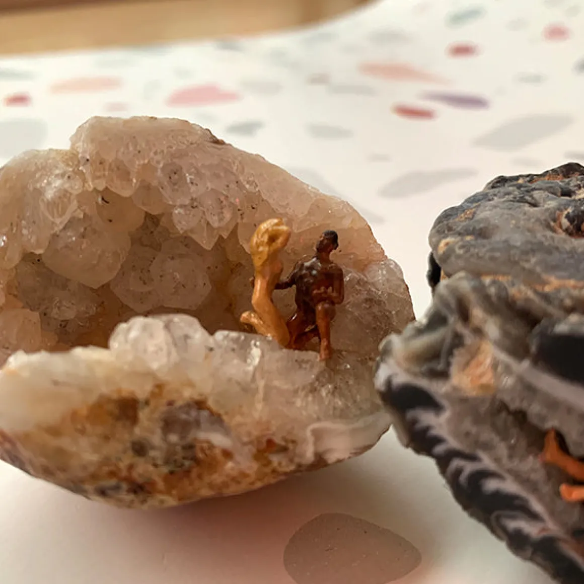 A miniature couple in the nude relaxes on or in their natural geode cave, appreciating the simple pleasures in life, like love, good company and feeling shamelessly naked.