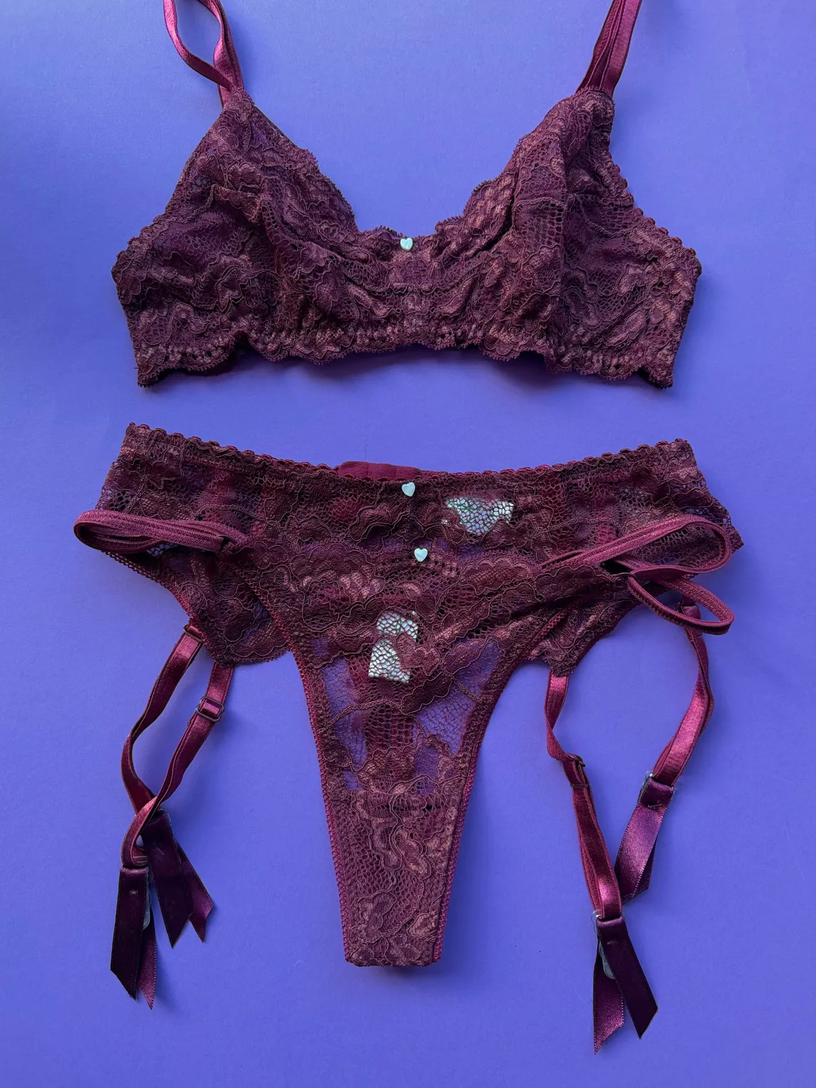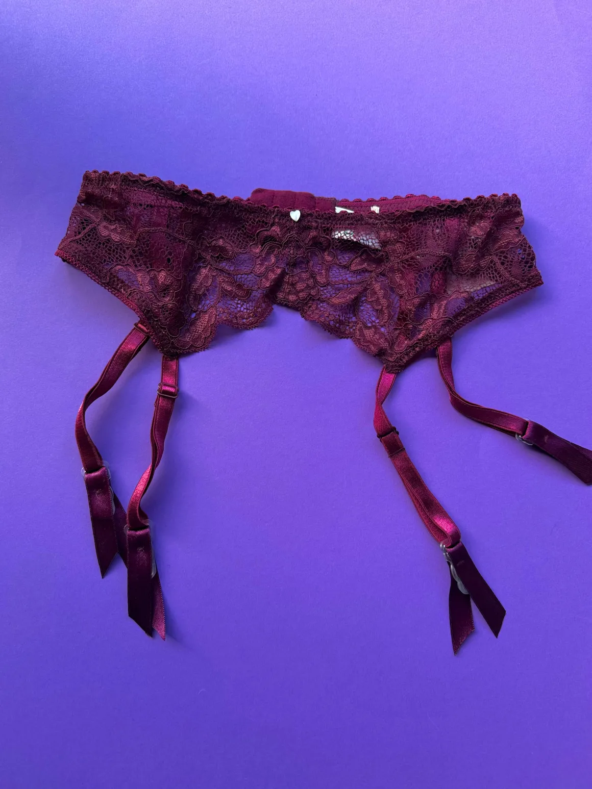 The lace garter belt to match back to Clo’s Fortuna set. Clasps in the back.