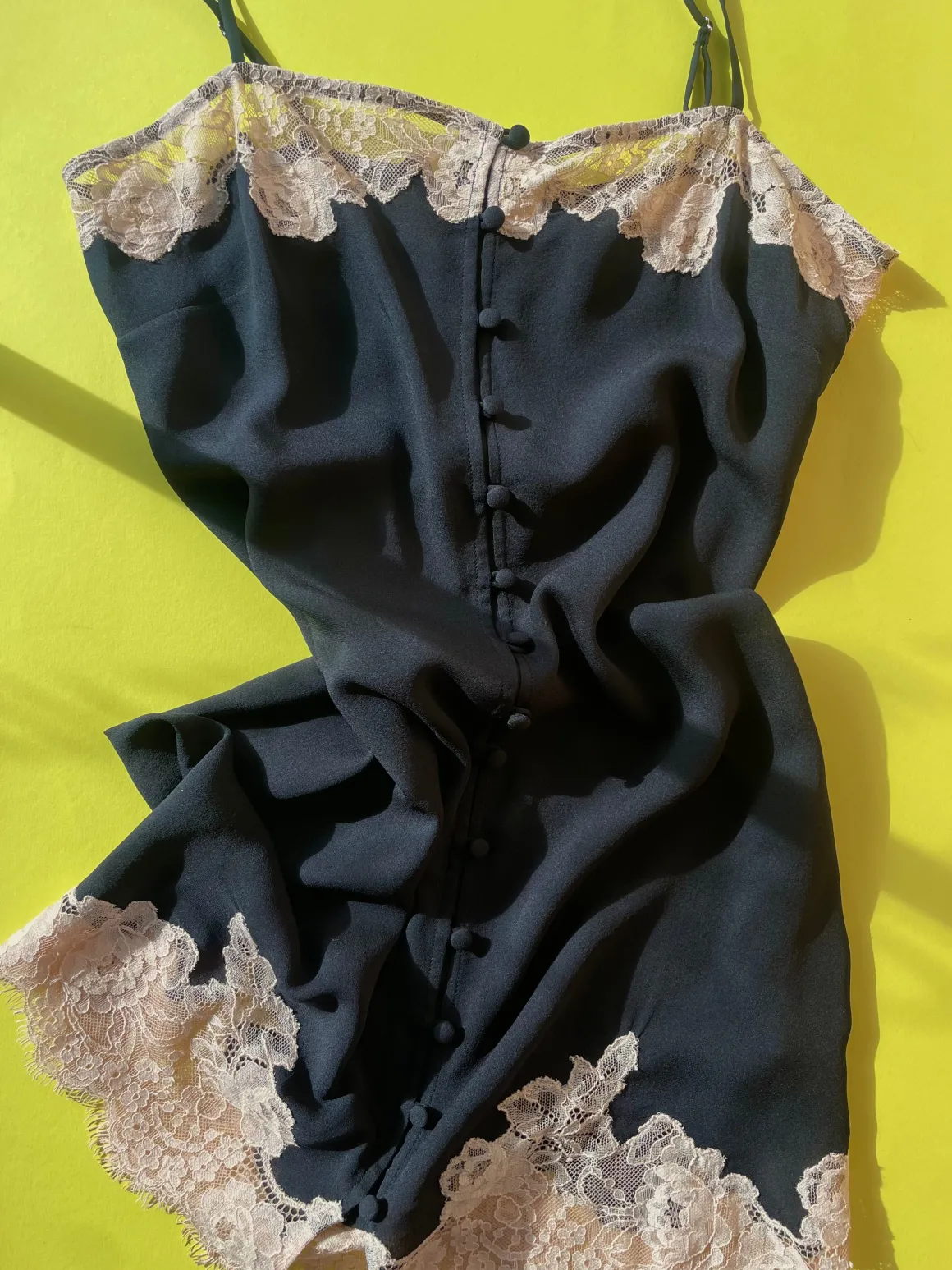 The most romantic silk slip! Features functional front buttons and adjustable straps.