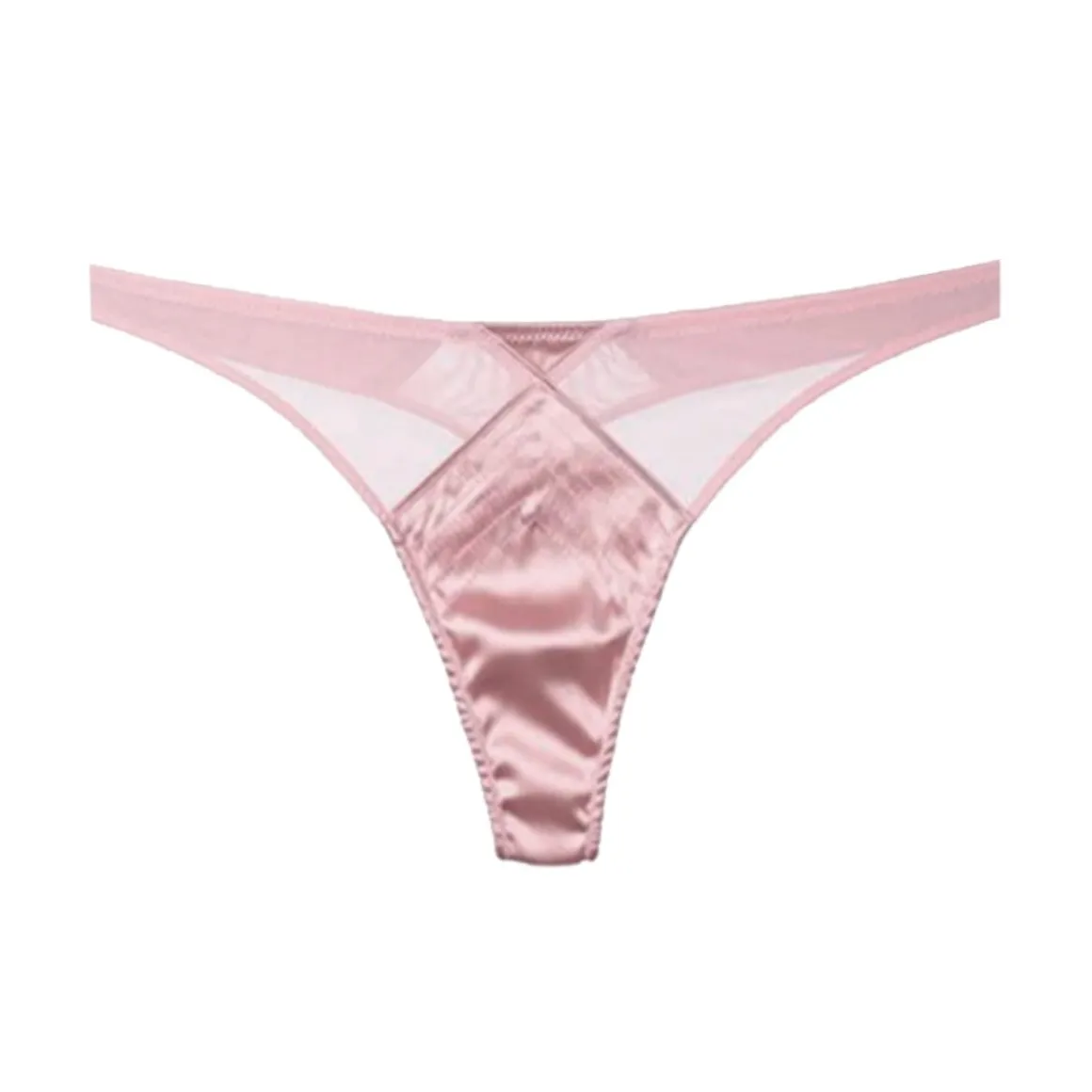 Silk satin stretch low-rise thong with mesh panel and back. Retro-style top stitching detail.