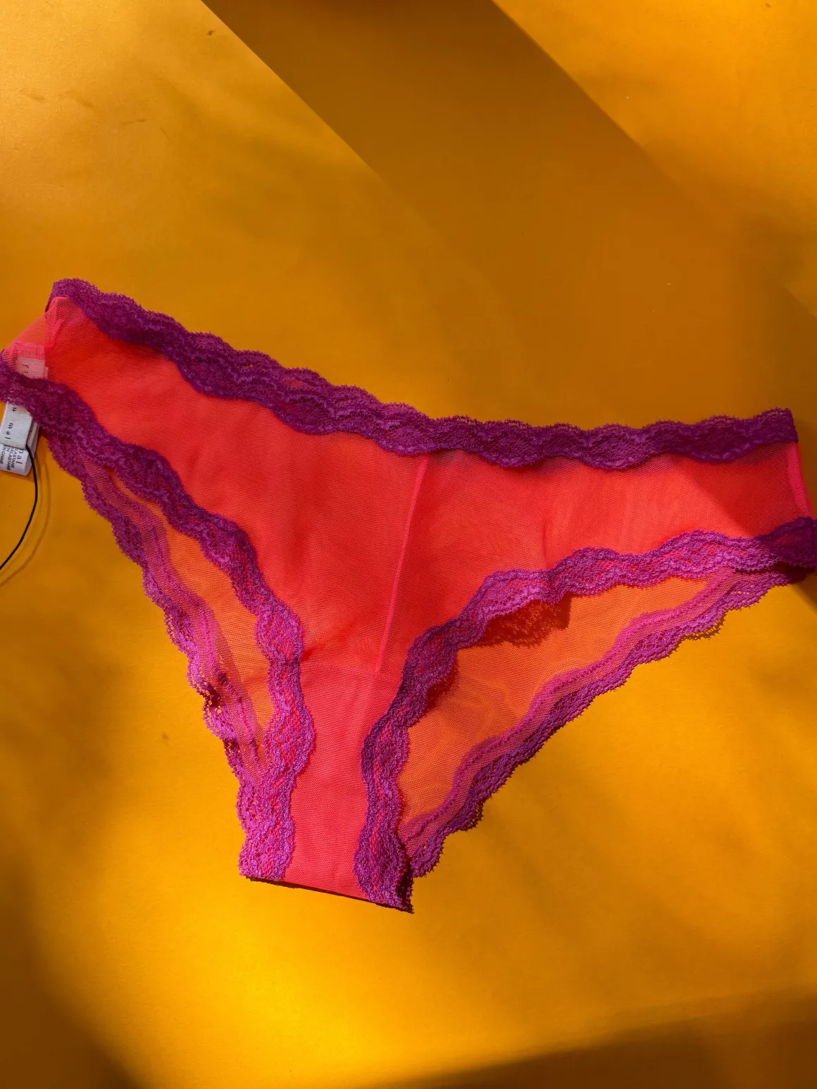 Sheer tulle cheeky bikini in a juicy coral with contrasting hot pink lace trim.