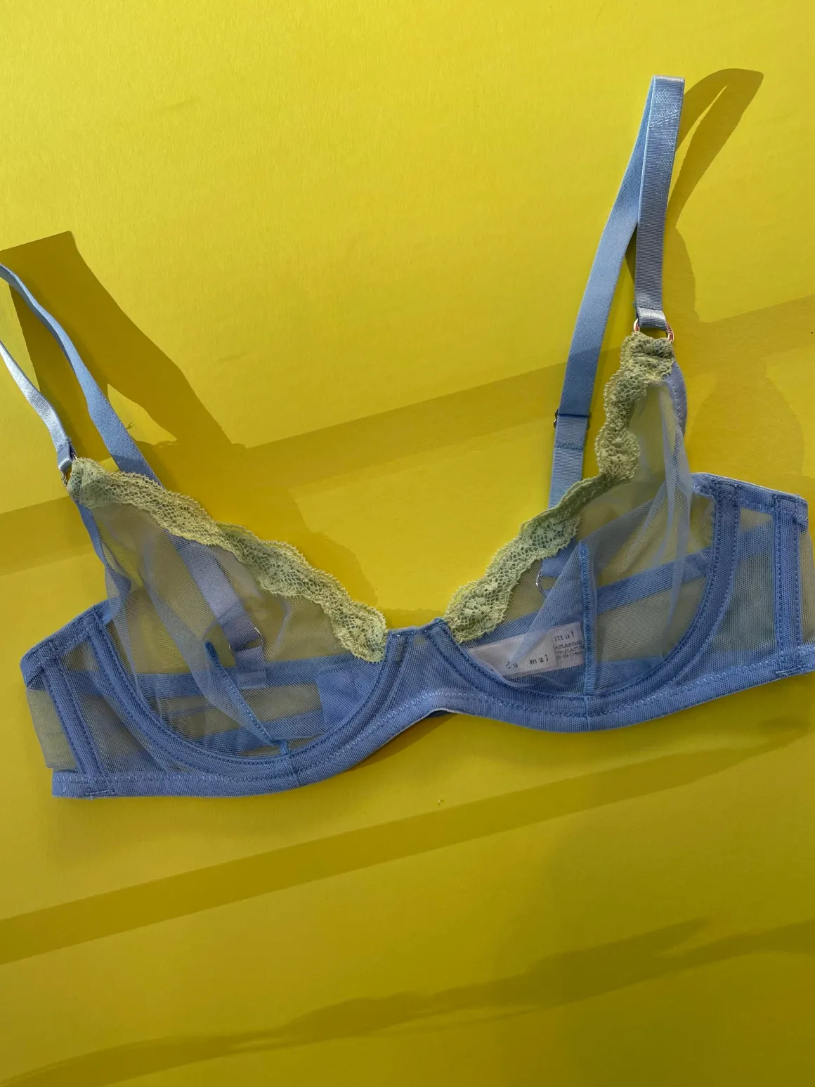 Your new favorite everyday bra. This lightweight sheer demi bra will keep you cooler in the hotter months. Light blue sheer tulle trimmed with contrasting pastel yellow lace. Offers support and a whole lotta flirty fun.