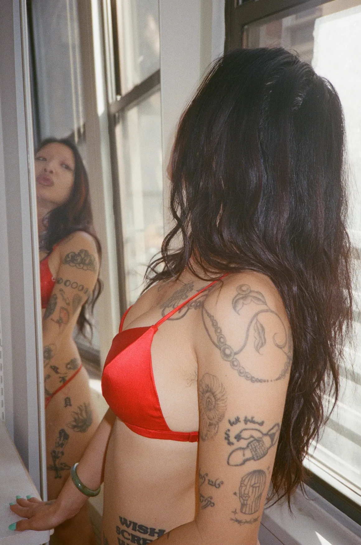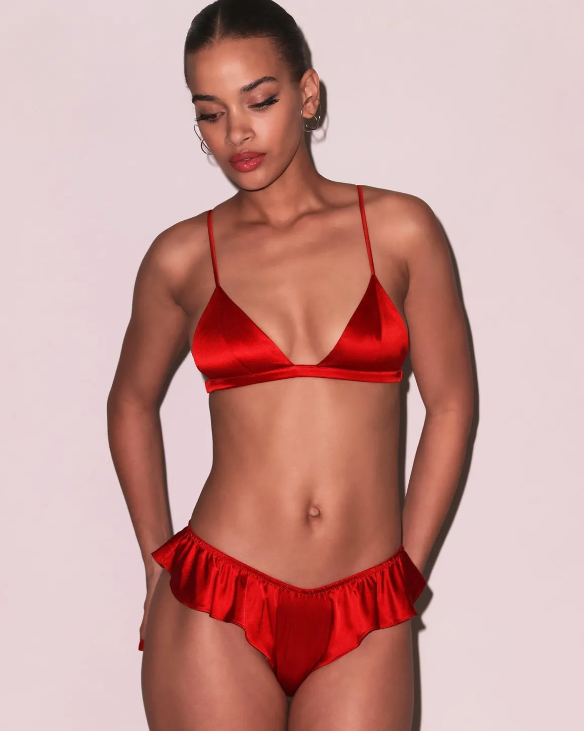 The best-selling silk triangle bra from Fleur du Mal! Made in luxurious silk and features adjustable delicate straps and gold hardware. Looks great worn underneath a blazer for a night out.