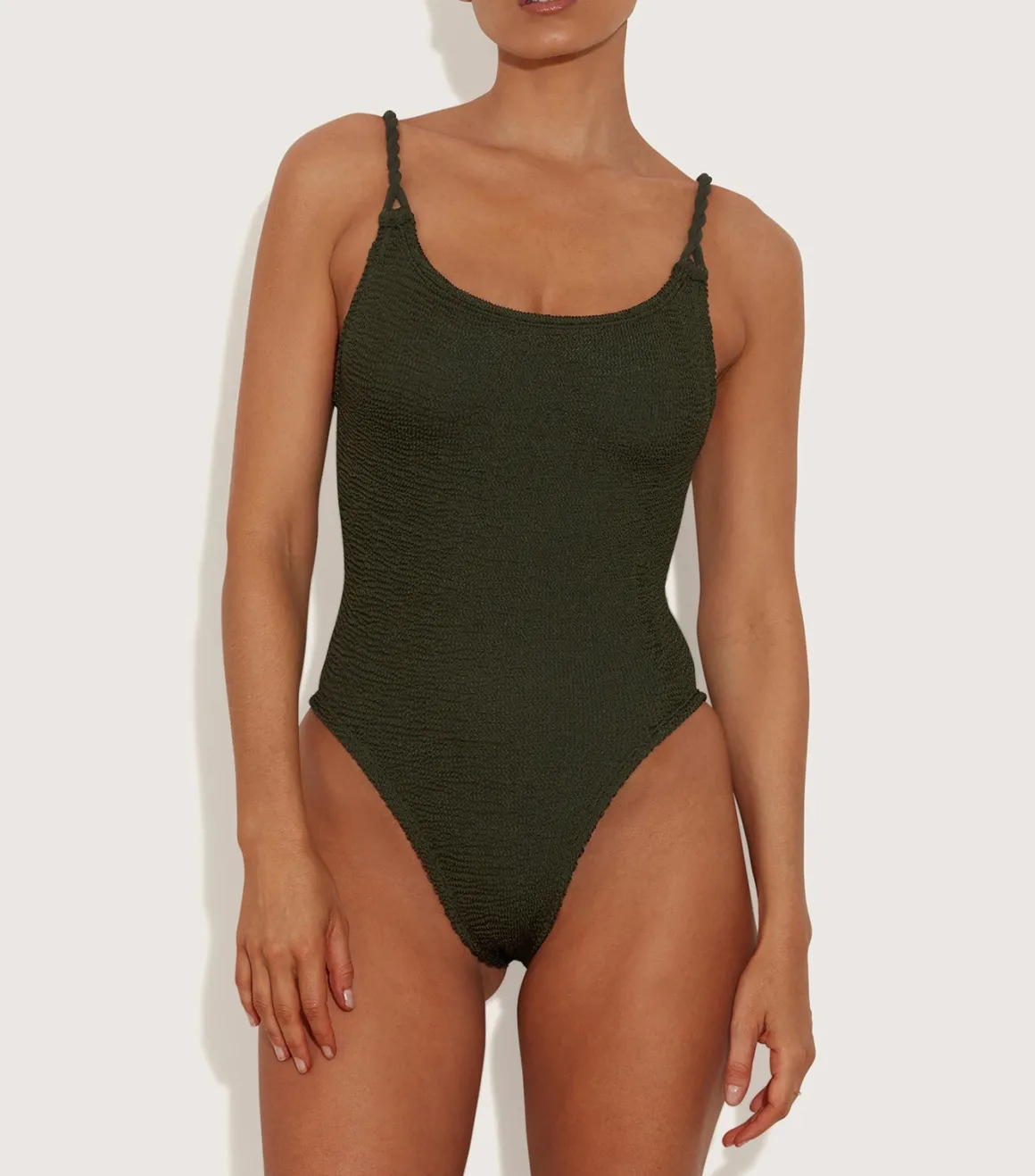 The new chic Hunza G Camille one piece is a classic scoop-neck once piece with a low back and tonal twisted strap details. The khaki has a slight sheen to it giving you that sparkle in the sun.