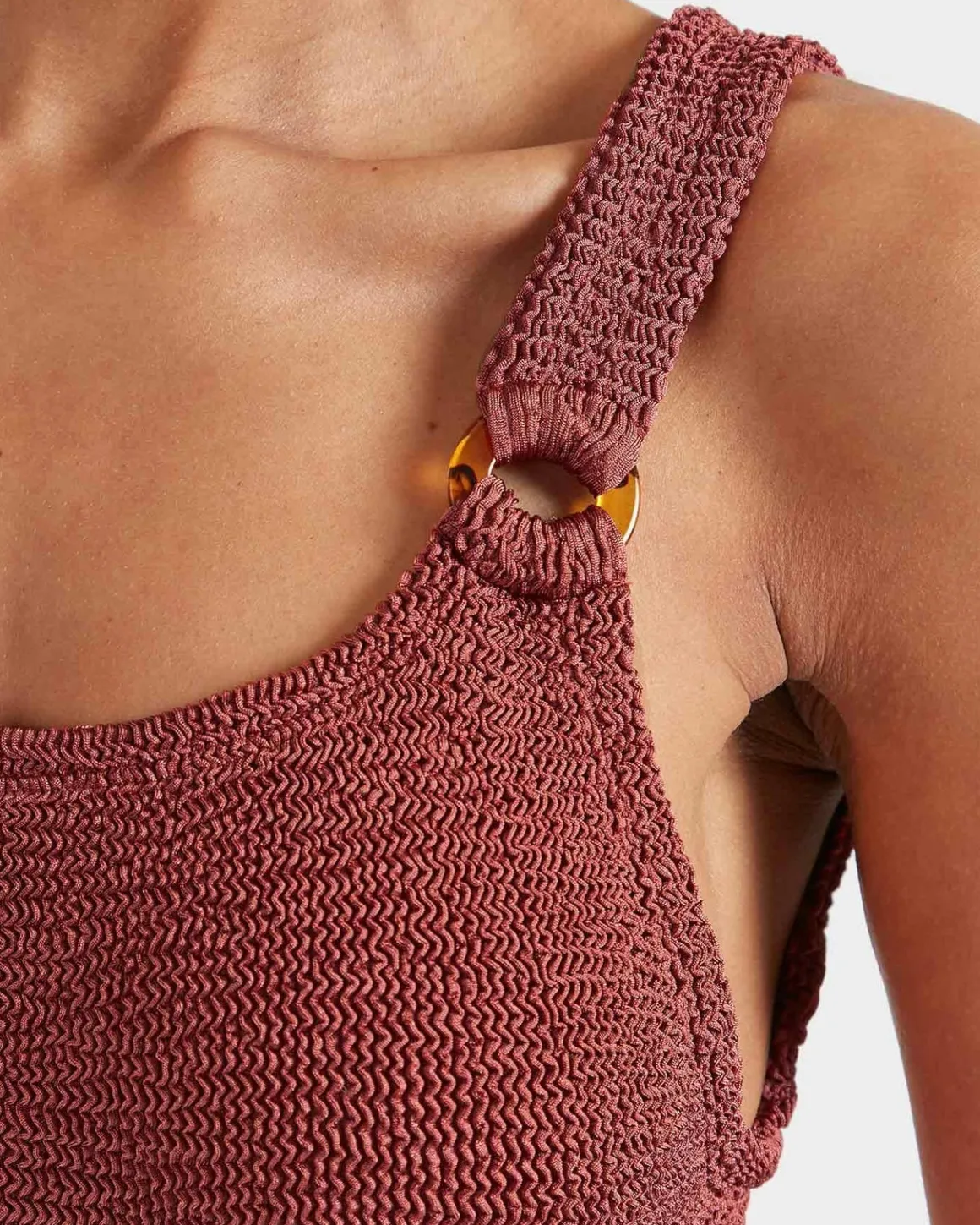 A great one piece with a slightly dipped neckline and low scoop back and tortoiseshell hoops. The signature Hunza G crinkle fabric is very forgiving and you won’t think twice about those poolside fries.