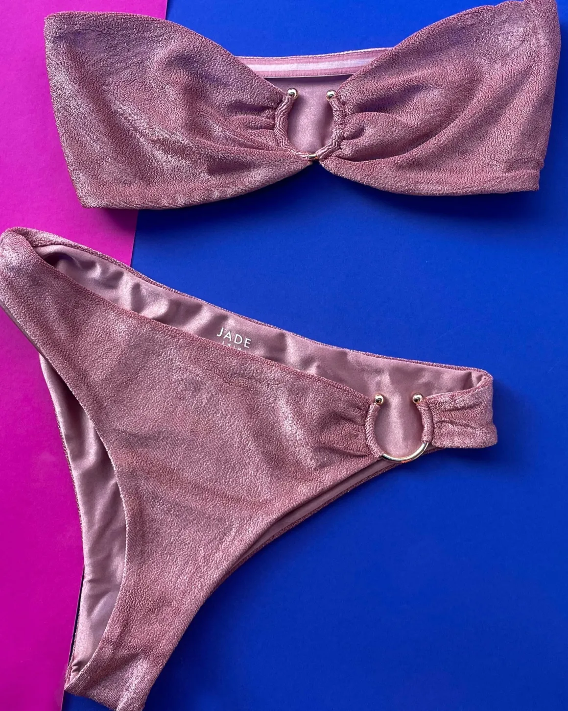 They say “In an ocean full of fish, be a mermaid.” Here’s a bikini for that seaside mermaid in you – a shimmery mauve terrycloth bikini in a sleek pullover strapless bandeau top. Gold hardware center detail. Wide band for support. In a soft terry fabric with a light-reflective finish.