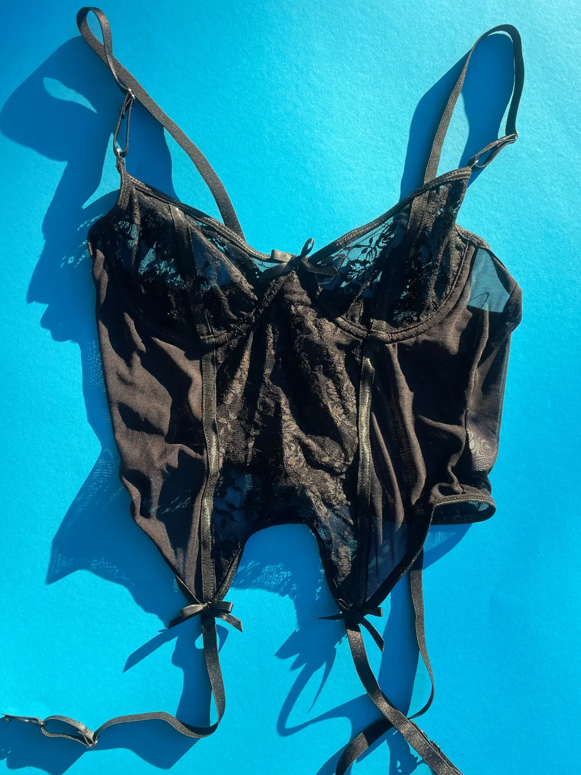 KissKill’s Evie corset is a mesh-bodied corset with underwire and lace cups.