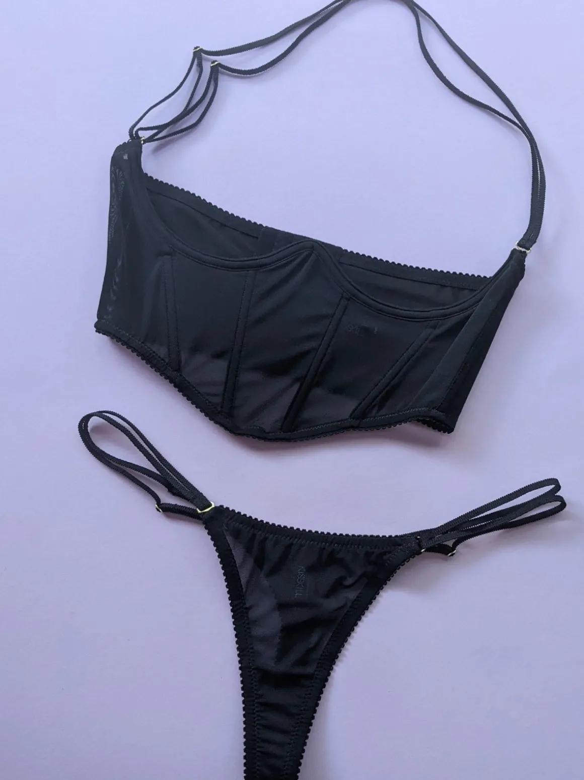 A barely-there g-string that feels likenothing on the skin. Thin adjustable double straps, picot edges on sheer mesh fabric, light gold hardware.