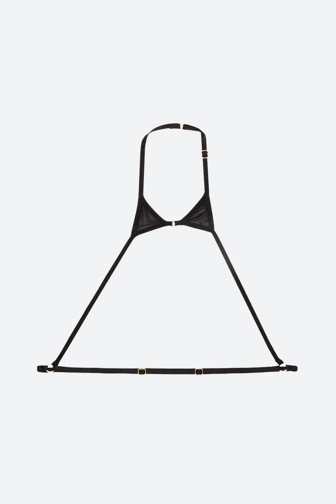 Put your best assets on display in this delicate open halter frame top with a playful front bow detail. Adjustable straps with hook and eye back closure.