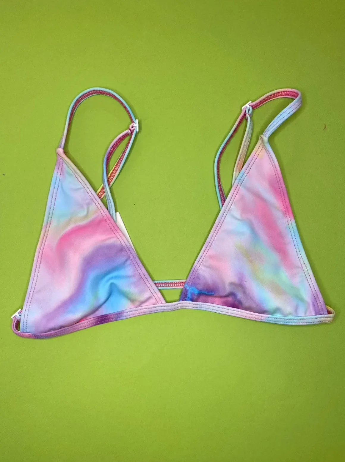Make your Barbie dreams come true in this little adjustable triangle bikini top. Made a little widerfor morecoverage. Fully adjustable shoulder and back straps.