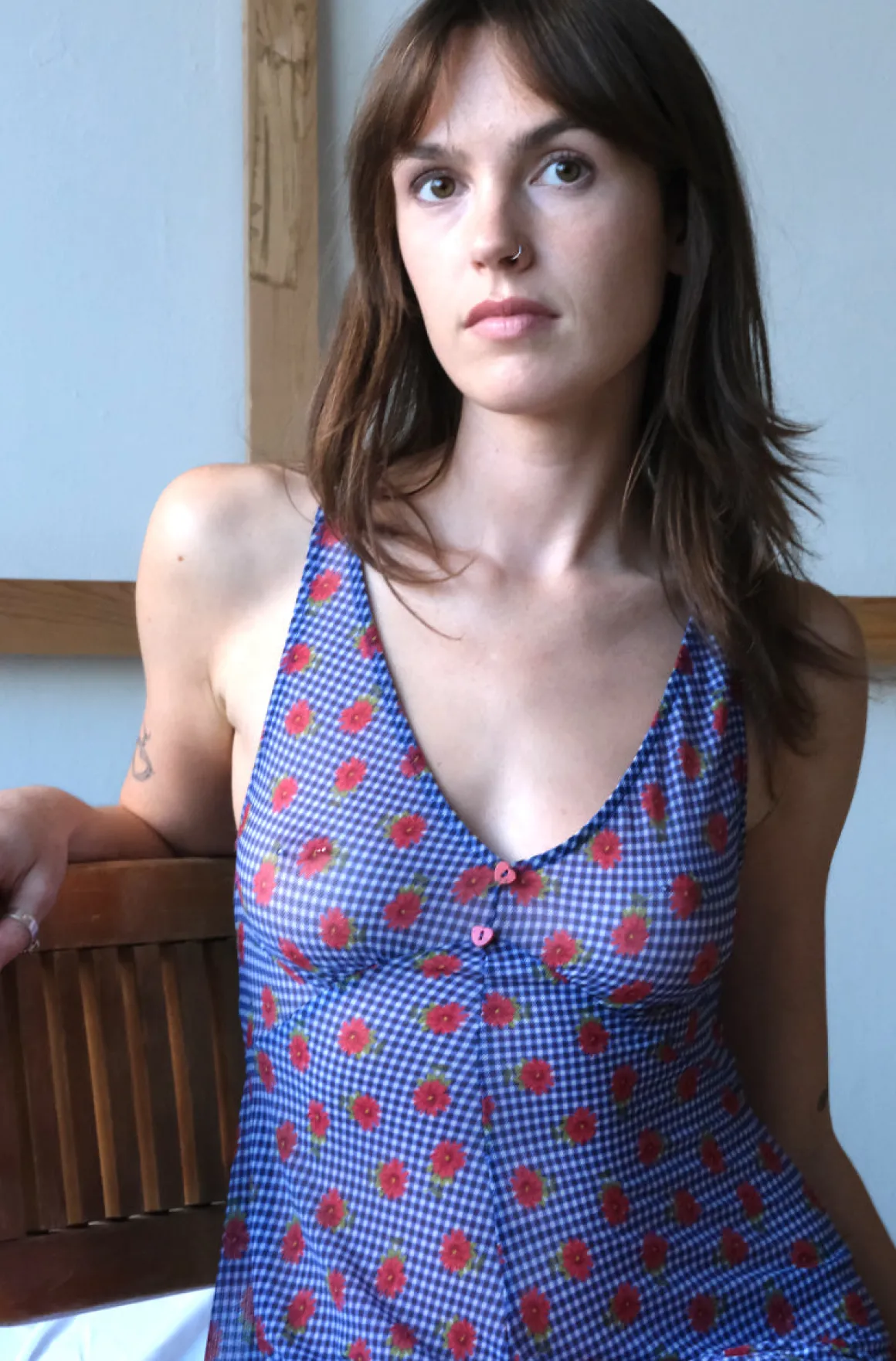 Sweet little romper that borrows from early beachwear aesthetics. Scoop front with underbust seams to flatter the chest and a flowy flared short that flirtatiously grazes the bum.