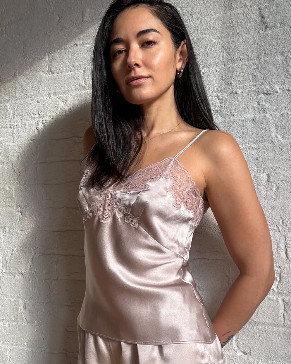 The sensual, yet sweet combination of the luxurious silk and soft lace detailing is what makes this the perfect, versatile cami. Dressy enough for a zoom call, and when paired with the matching tap pant, it’s a dreamy sleep set.