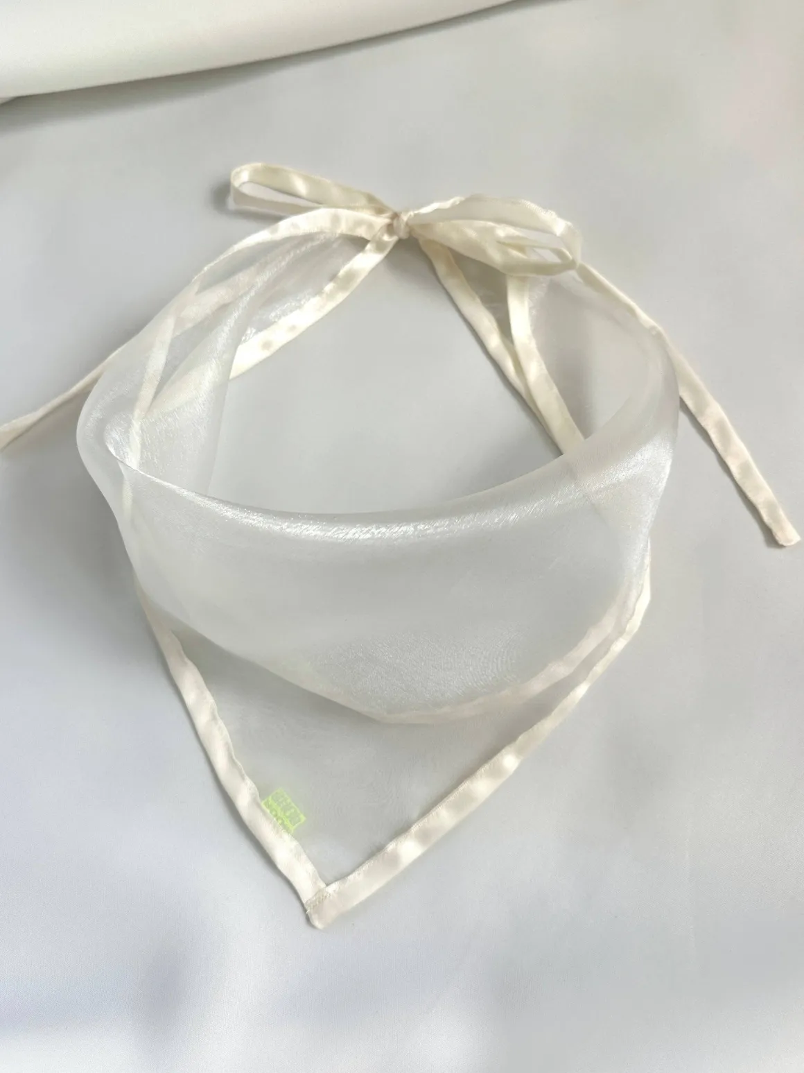 Dreamy sheer organza framed with silky satin ribbon in an easy tie back headscarf, also extremely cute as a neck scarf.