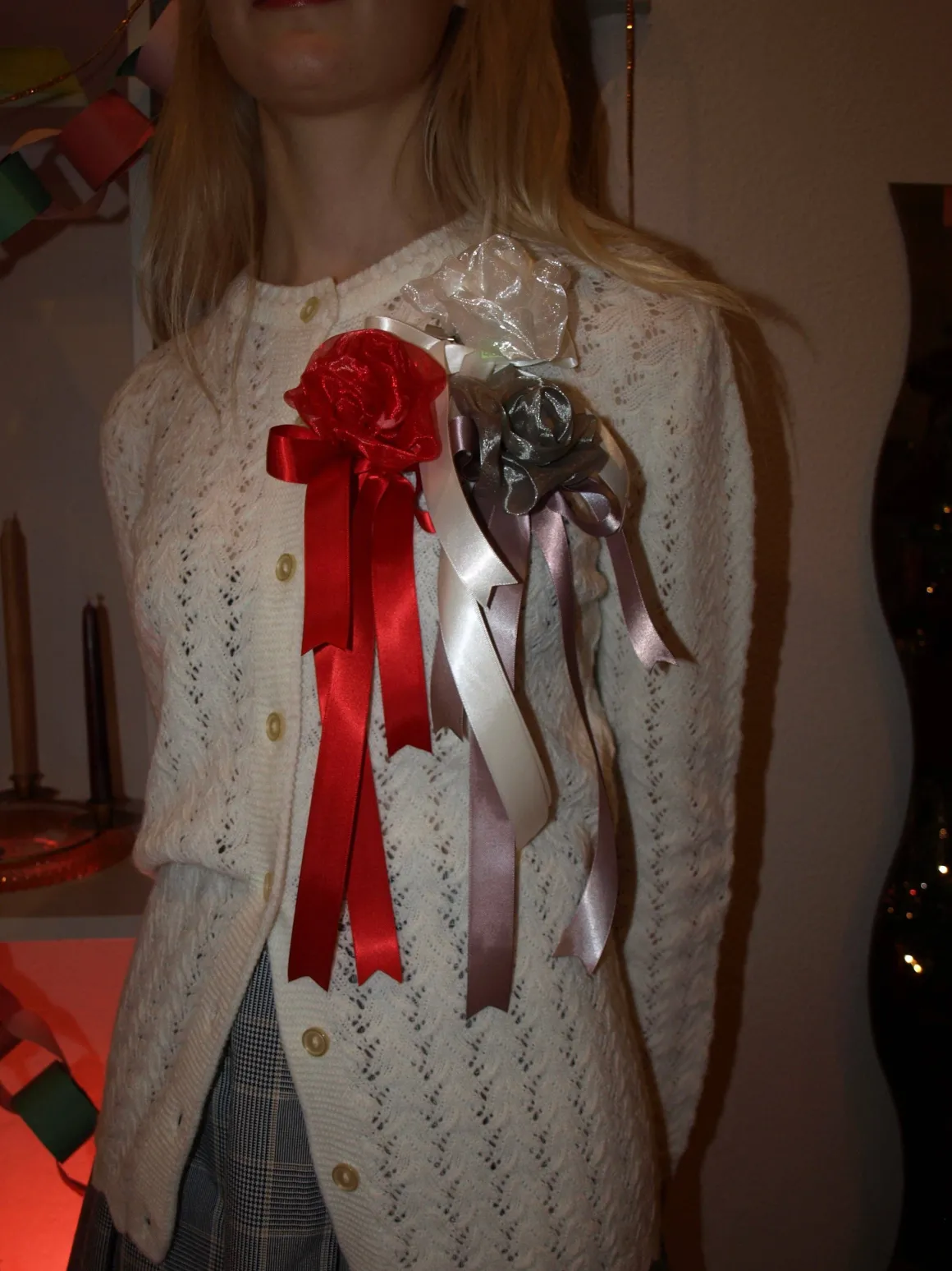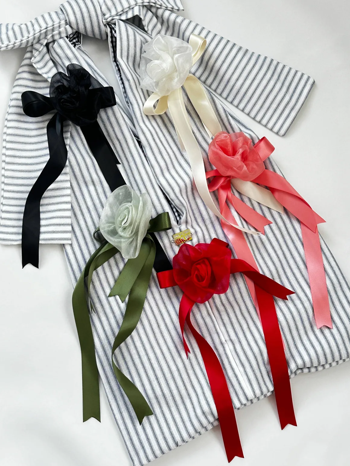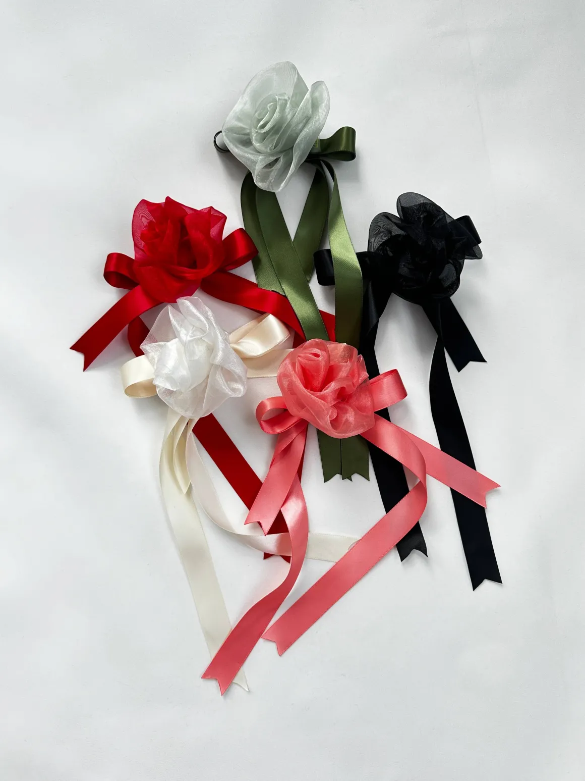 An organza rose, satin bow pin that you can place on your jacket, bag, or anywhere you’d like.