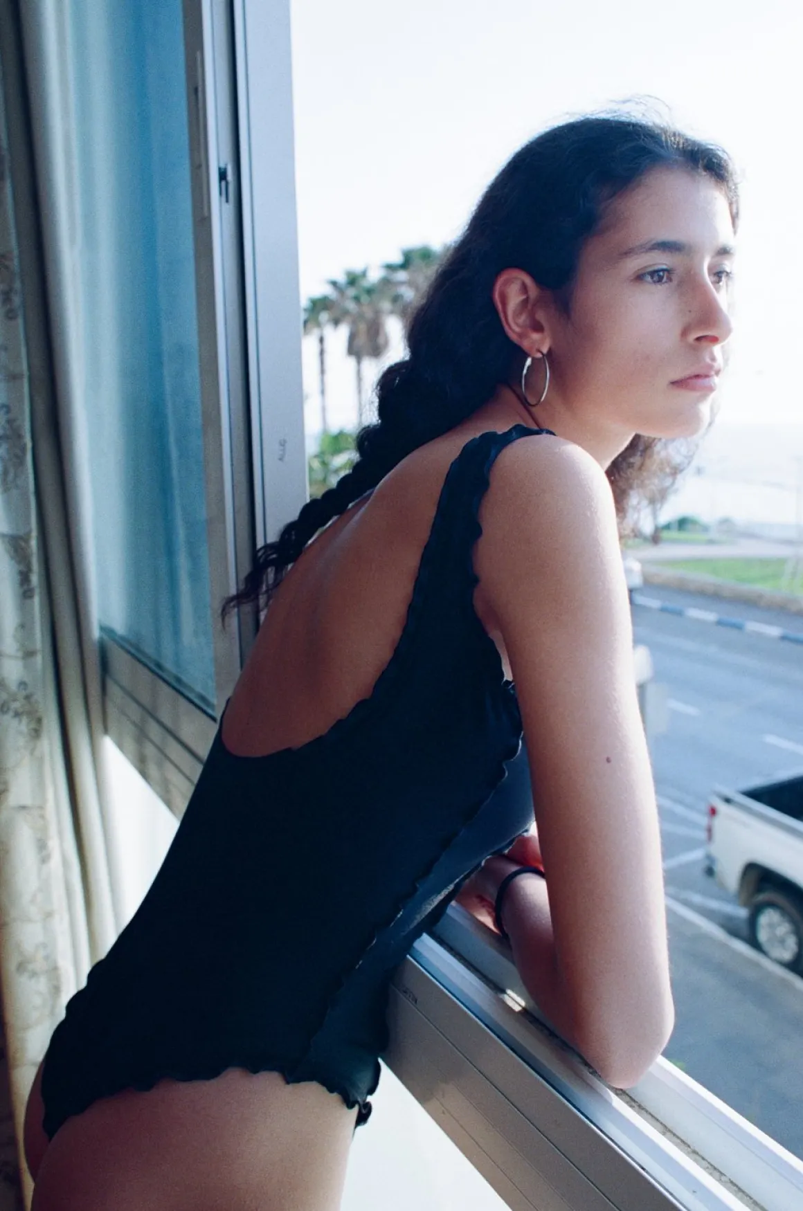 A square neckline full corset one-piece bathing suit, with lettuce edge finishings. V back. Medium bum coverage. Square neck line is flatter for all bust sizes. Doubles as a bodysuit!