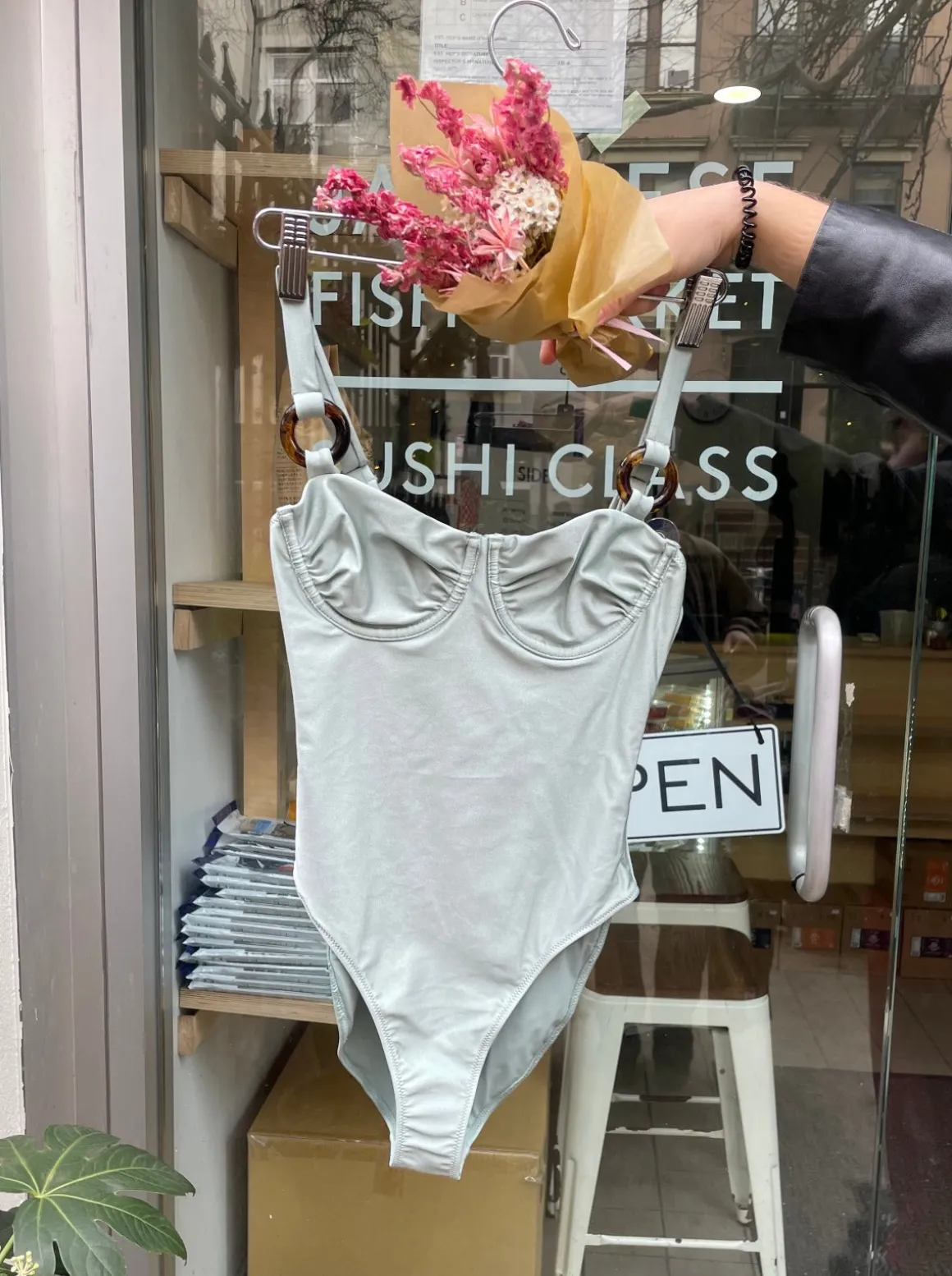 This sleek underwire one piece, with its chic tortoiseshell details on the straps, gives off major vacay vibes. The ruched cups are flattering whether you fill out the cups or not. Shimmery sage color will make you feel like a modern mermaid.
