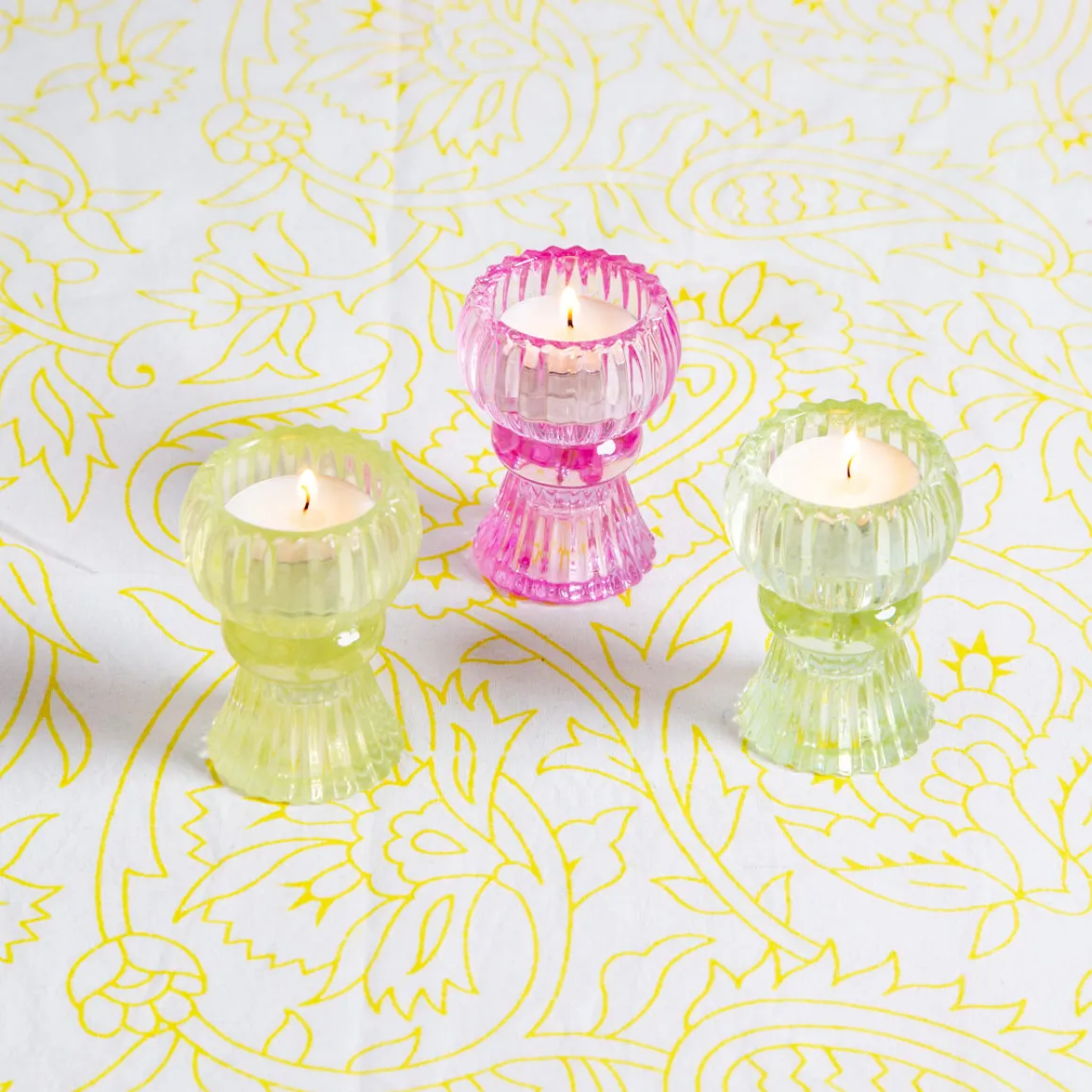 Colorful glass candle holders for your new tapered candles from Talking Tables!